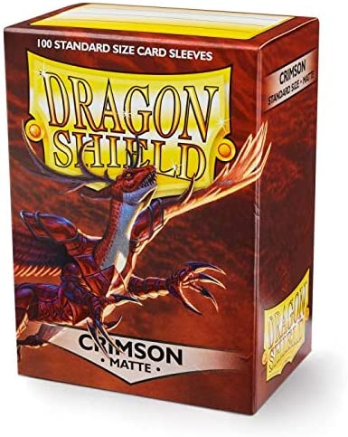 "Clear front & Matte Crimson back. The royal flames of duty and honor. Matte sleeves are our popular line of textured Dragon Shield with superior handling. A perfect mix of durability and shuffle-ability. The professor's #1 pick for card sleeves. The sturdy cardboard box fits 75+ single sleeved cards or 65+ double sleeved cards. Every box has a label at the top of the box for personalization. PVC-free polypropylene sleeves, no acid. Archival safe. Matte 120 μm quality thickness. For cards measuring up to 63x88 mm's (2½""x3½"")."
