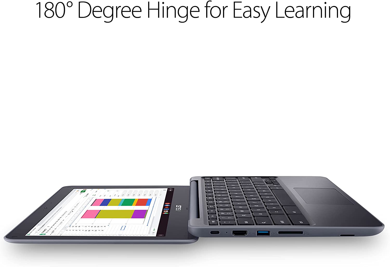 The ASUS Chromebook C203, a rugged K-12 11.6” Chromebook featuring a 180-degree screen, spill-resistant keyboard, and USB Type-A / Type-C connections.