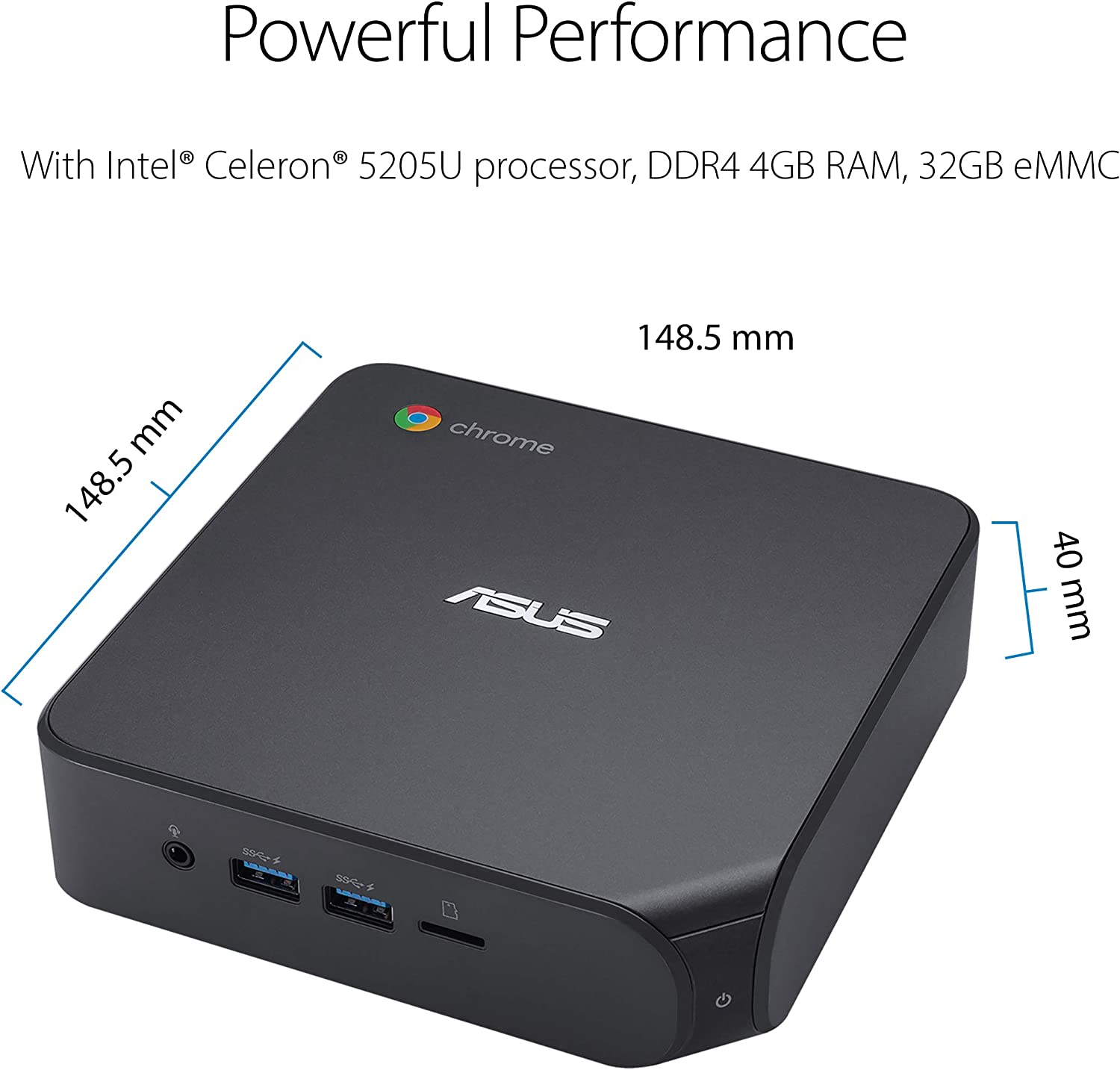 ASUS Chromebox 4 features Intel Celeron 5205U processor and DDR4-2400 memory for faster, smoother and more energy-efficient performance. It supports up to three 4K displays and is equipped with a versatile USB-C port that enables power delivery and DisplayPort connections. Enjoy Google-enabled apps with WiFi 6 for ultrafast network speeds.