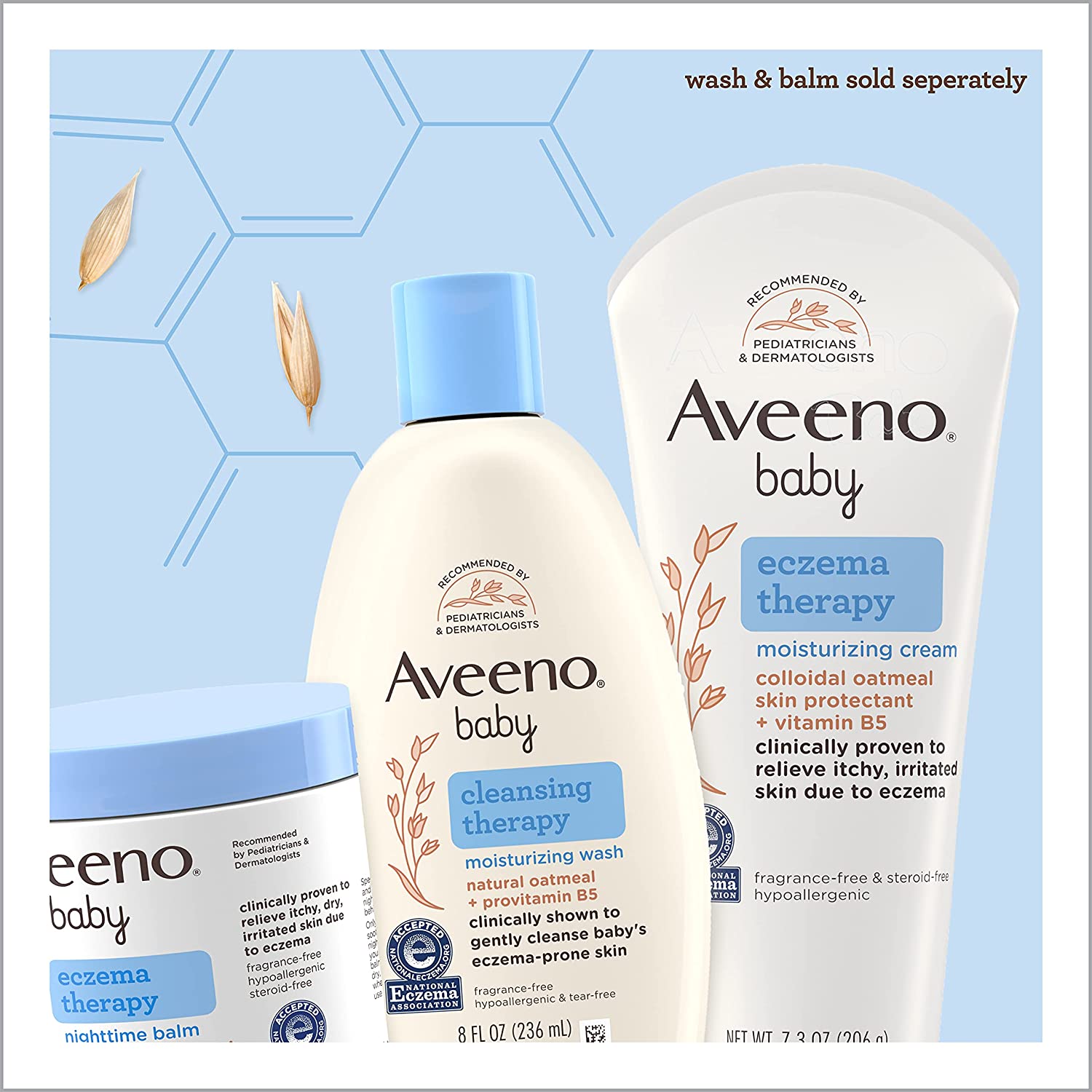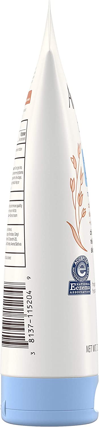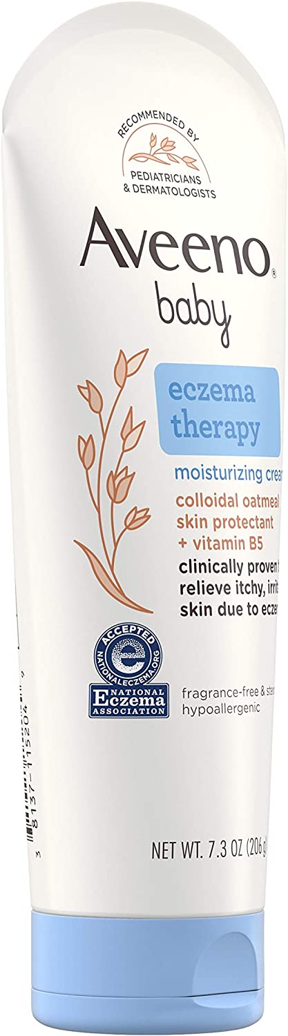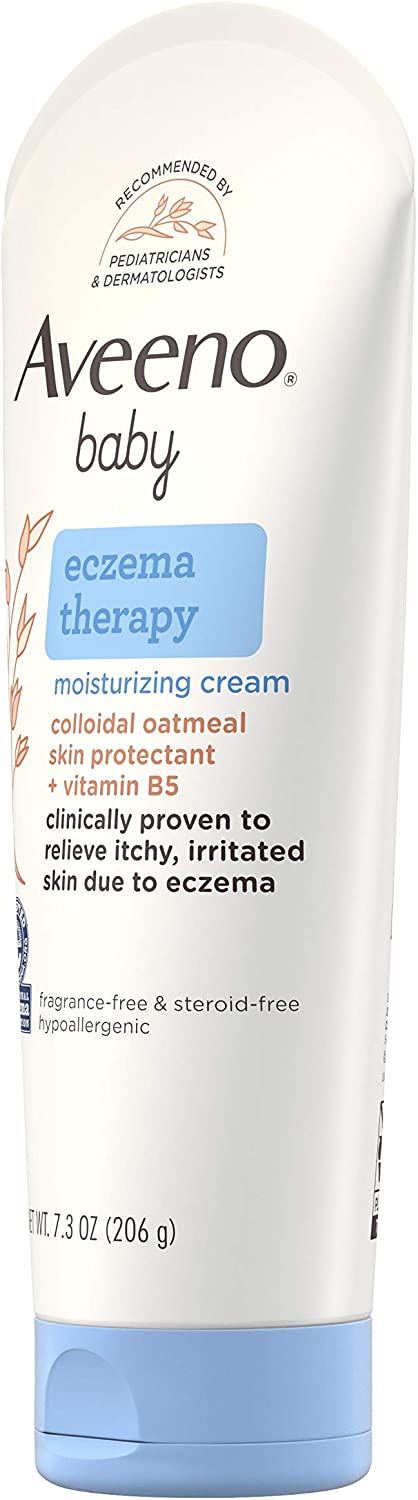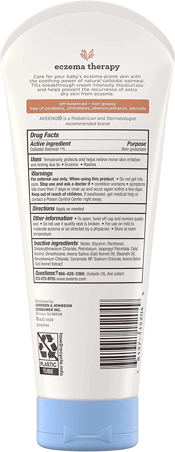 Aveeno baby eczema therapy moisturizing cream helps relieve dry, itchy, irritated skin due to eczema. Developed with leading dermatologists, this hypoallergenic baby eczema cream uses the soothing power of natural colloidal oatmeal to help strengthen the skin's moisture barrier for prevention and protection against dryness. Formulated specially for babies, this non-greasy baby cream is clinically proven to relieve itchy, irritate skin due to eczema and intensely moisturizes skin to prevent the recurrence of extra dry skin from eczema. The unique formula, made with Natural Colloidal Oatmeal skin protectant and vitamin B5, is pH-balanced and free from steroids, fragrances, parabens, phthalates and phenoxyethanol. Aveeno is recommended by pediatricians and dermatologists and this cream is accepted by the National Eczema Association.