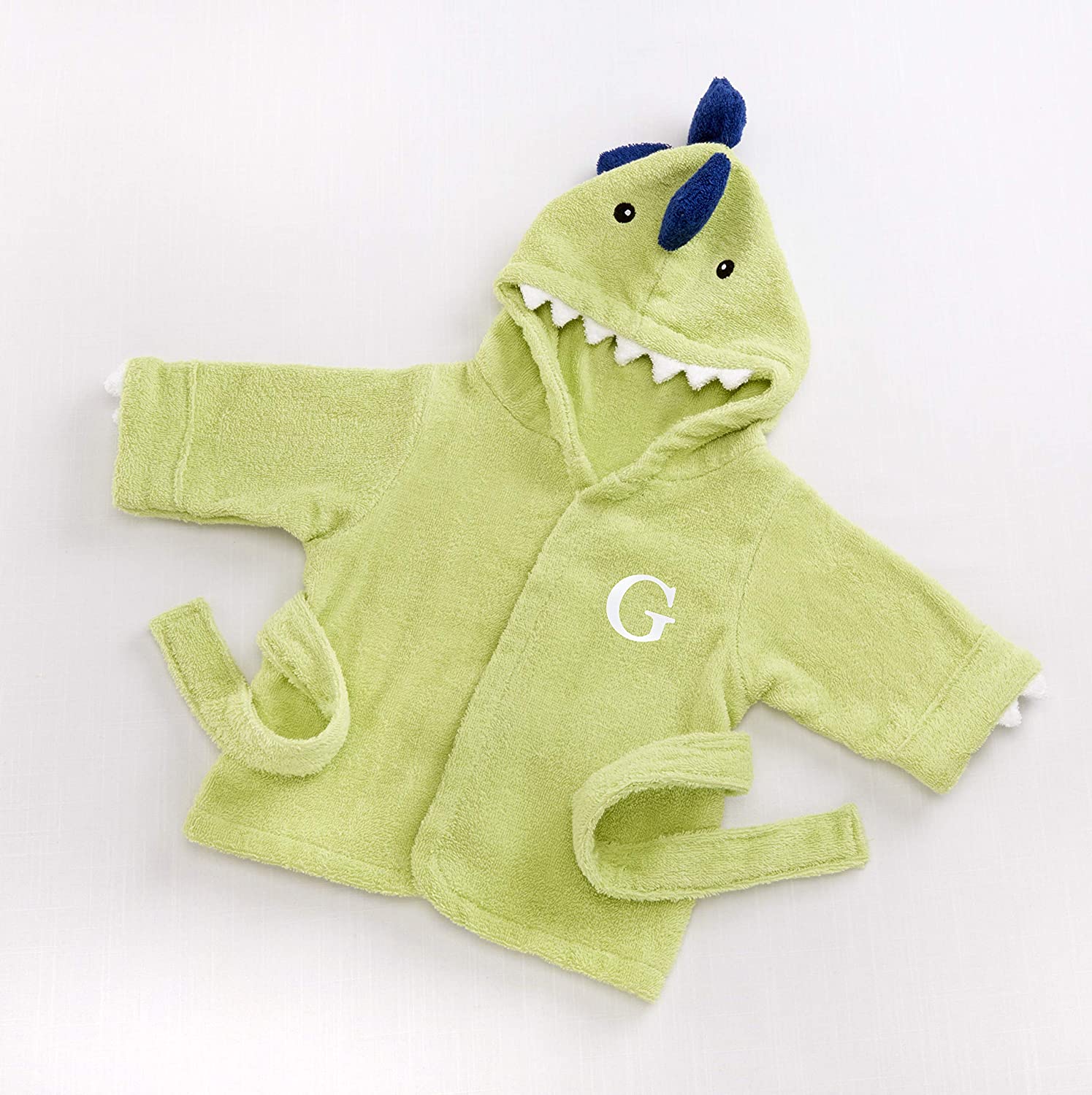 When dinosaurs roamed the earth, they were nowhere near this huggable! A new baby is in for some prehistoric pampering after every bath--just tell the new mom and dad you dinosaur it--and knew baby had to have it! Features and facts: Jurassic-green, hooded spa robe with embroidered black eyes, black, 3-D dyno "spikes", pearly-white terry dyno-teeth and attached belt closure. Machine-washable terry cloth. Size 0-9 months.