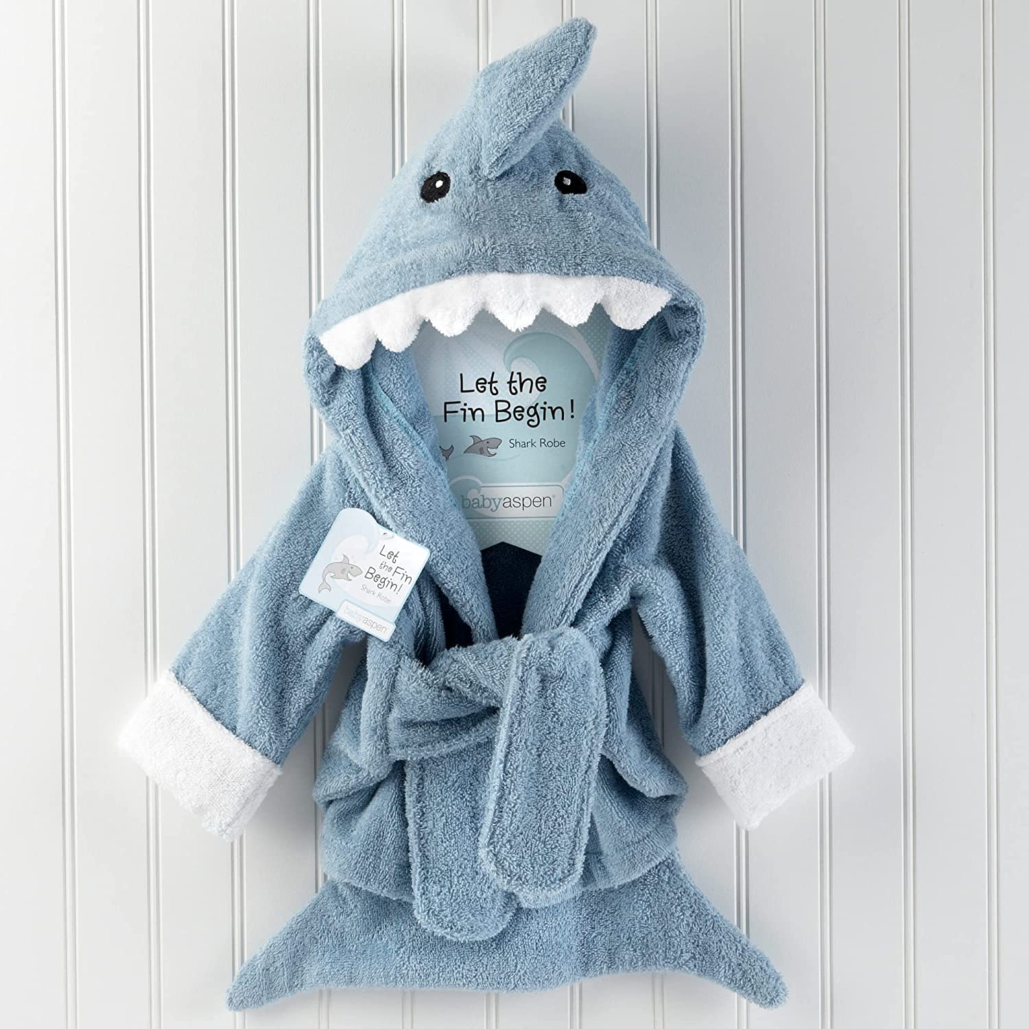 Mom and Dad are going fall for this terry-ific sea-inspired robe--hook, line and little stinker. After a refreshing bath time for baby, they'll want to wrap their wiggly, wet one in something cozy, absorbent and cute. Baby Aspen's Terry Shark Robe is reel-y fun and oh, so fine.