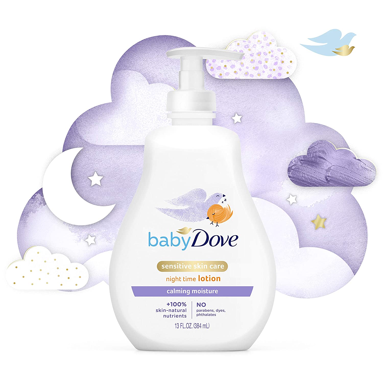 Looking for ways to help your baby sleep through the night? For experts and real parents, the key is sticking to a routine. Using baby body lotion with a calming scent can be key to your baby's sleep routine. That's why we formulated Baby Dove Calming Moisture Hypoallergenic Baby Lotion with a soothing scent to help baby wind down at bedtime while nourishing their delicate skin overnight. A gentle massage before bed is a great way to soothe your little one while nourishing their skin as your baby sleeps. And with a calming chamomile scent, this baby lotion is the perfect addition to baby’s nighttime routine. This scented lotion offers more than the gentle touch needed to care for delicate baby skin. It's made with 100% skin-natural nutrients, which are identical to those naturally found in skin, and prebiotic moisture to help replenish the essential moisture and nutrients that baby’s skin can lose overnight. The ultra-gentle, hypoallergenic formula is also created free from dyes, parabens, and phthalates. After washing your baby with Baby Dove Calming Moisture Hypoallergenic Wash and then drying, warm Baby Dove Calming Nights Baby Lotion in your hands and gently massage onto their body to nourish baby skin. We know there’s no right or wrong way to be a parent – only your way. That’s why Baby Dove is here to help give you confidence that you’re providing the best skin care for your baby's skin. Our Calming Moisture Hypoallergenic Baby Lotion is sold in 13 oz. and 20 oz bottles. Looking for something for extra sensitive skin? Look for Baby Dove Fragrance-Free Moisture Hypoallergenic Lotion.