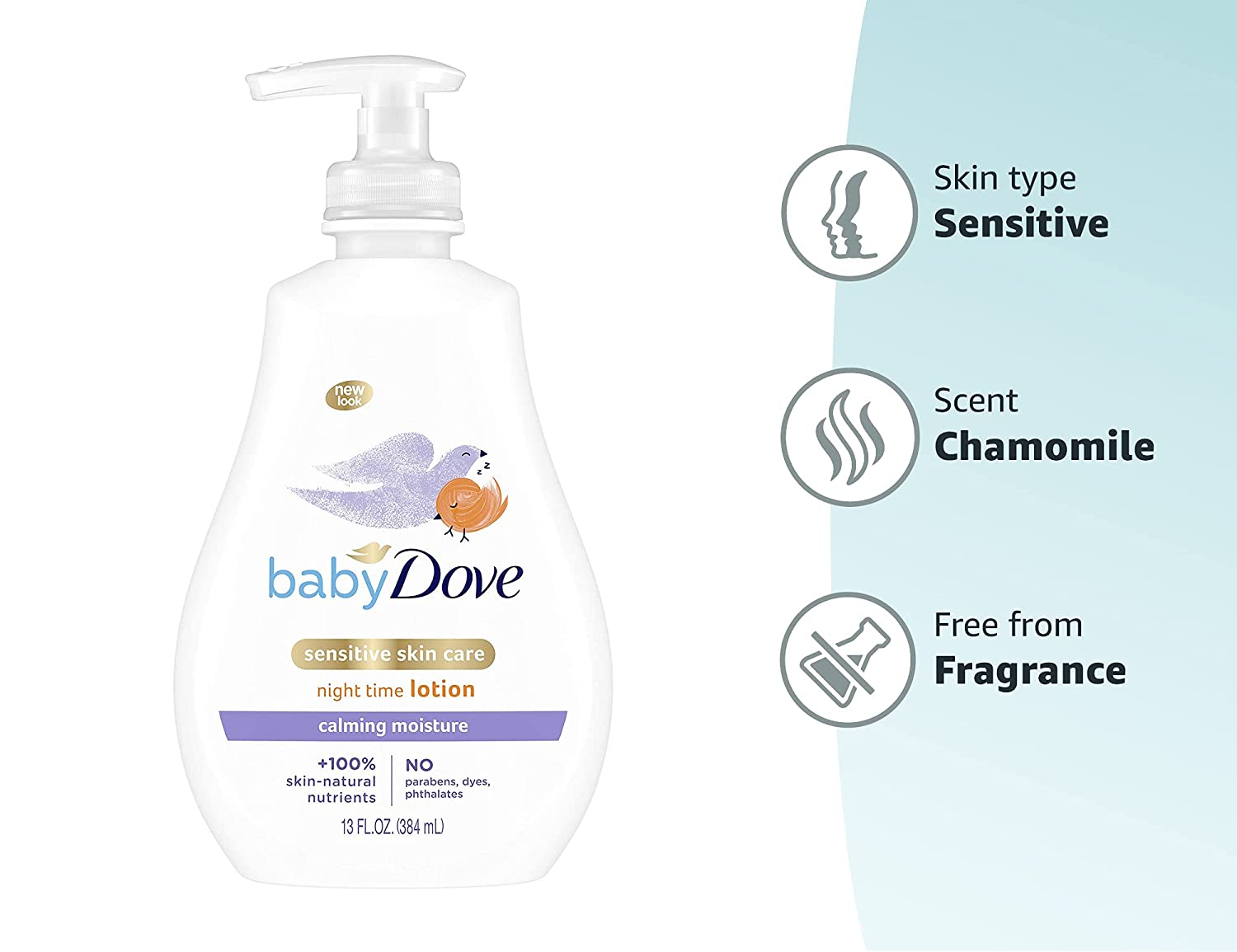 Looking for ways to help your baby sleep through the night? For experts and real parents, the key is sticking to a routine. Using baby body lotion with a calming scent can be key to your baby's sleep routine. That's why we formulated Baby Dove Calming Moisture Hypoallergenic Baby Lotion with a soothing scent to help baby wind down at bedtime while nourishing their delicate skin overnight. A gentle massage before bed is a great way to soothe your little one while nourishing their skin as your baby sleeps. And with a calming chamomile scent, this baby lotion is the perfect addition to baby’s nighttime routine. This scented lotion offers more than the gentle touch needed to care for delicate baby skin. It's made with 100% skin-natural nutrients, which are identical to those naturally found in skin, and prebiotic moisture to help replenish the essential moisture and nutrients that baby’s skin can lose overnight. The ultra-gentle, hypoallergenic formula is also created free from dyes, parabens, and phthalates. After washing your baby with Baby Dove Calming Moisture Hypoallergenic Wash and then drying, warm Baby Dove Calming Nights Baby Lotion in your hands and gently massage onto their body to nourish baby skin. We know there’s no right or wrong way to be a parent – only your way. That’s why Baby Dove is here to help give you confidence that you’re providing the best skin care for your baby's skin. Our Calming Moisture Hypoallergenic Baby Lotion is sold in 13 oz. and 20 oz bottles. Looking for something for extra sensitive skin? Look for Baby Dove Fragrance-Free Moisture Hypoallergenic Lotion.