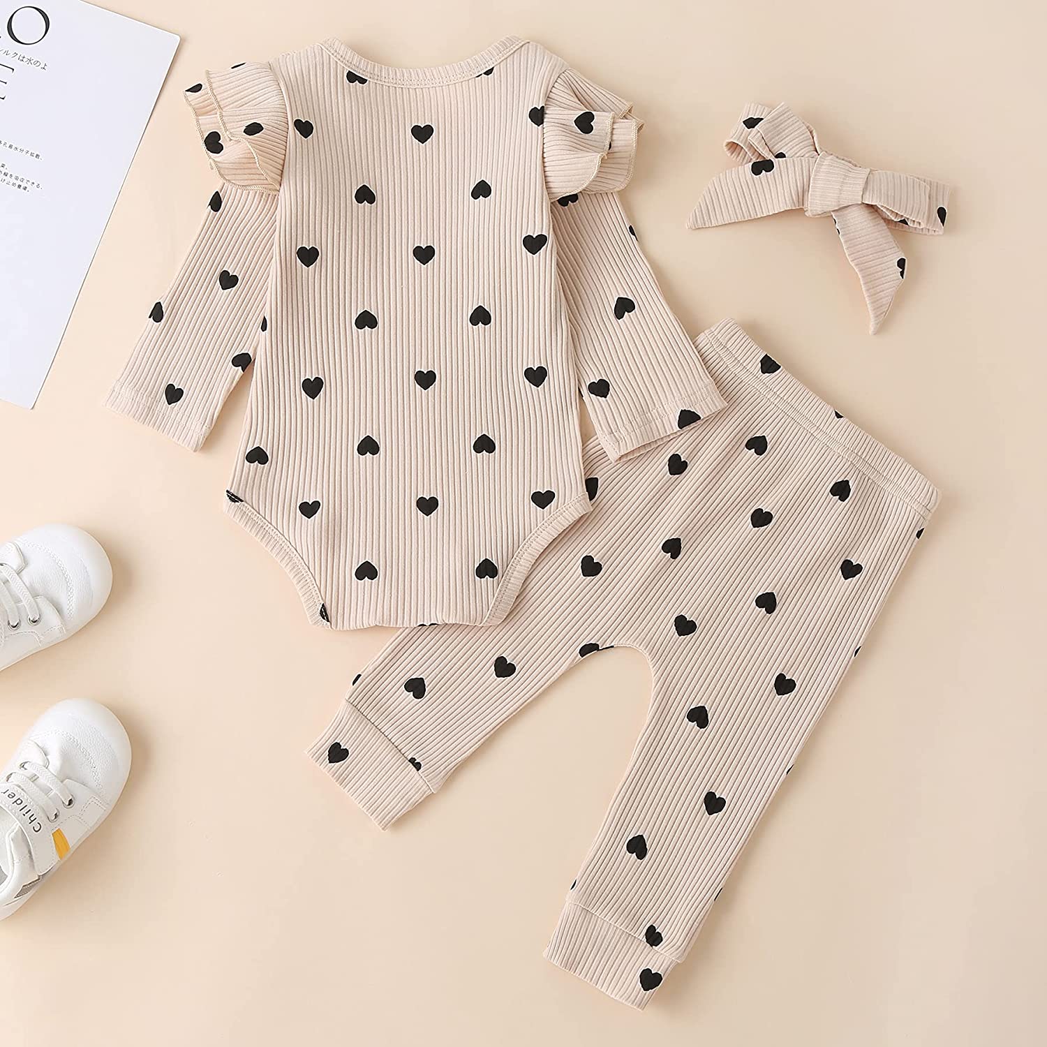 These perfect baby girl clothes have snap-up onesies for easier diaper changes. It is also embellished with heart print for an exceptional look. The ruffled layered shoulder long sleeve romper and frill pants will highlight your beauty. It is completed with matching bow knot headbands, you can't go wrong.