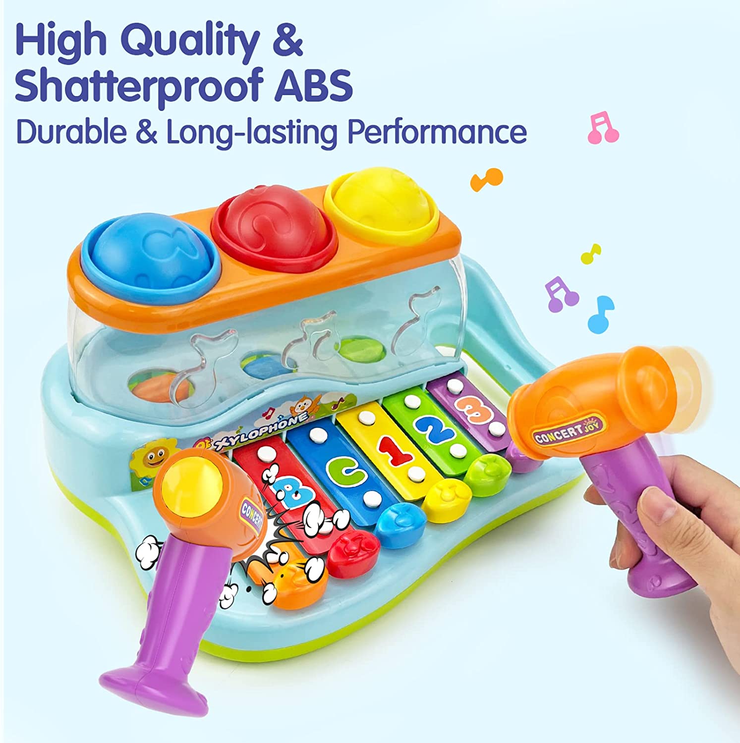 Explore the different notes and sounds by letting the balls fall on the keys or slide out the slideway and create your own melodies with the mallet! With the hammer pounding xylophone, there are many ways to make music!