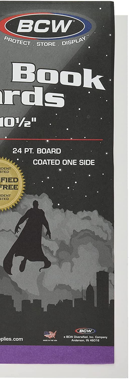 The BCW Silver Comic Backer Boards are made from a full 24 point solid bleached sulfate, coated on one side with a buffered with 3% calcium carbonate and are precision cut to size. Use this item along with silver comic bags to protect and store your collectible comics. se with BCW Current Poly & Mylar Bags (Each Sold Separately).