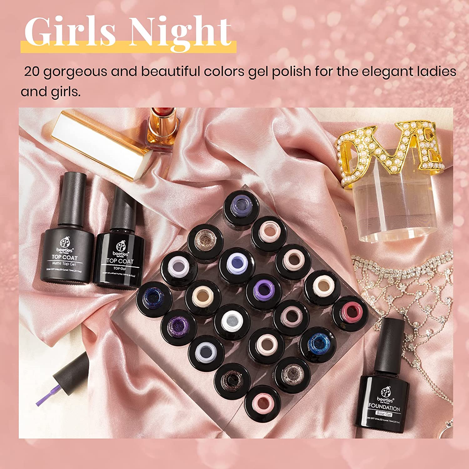 Beetles 20Pcs Gel Nail Polish Kit, with Glossy & Matte Top Coat and Base Coat- Girls Night Collection Popular White Nude Gray Glitters Gel Polish Soak Off Gel Nail Kits Mother's Day Gifts for Women Gi