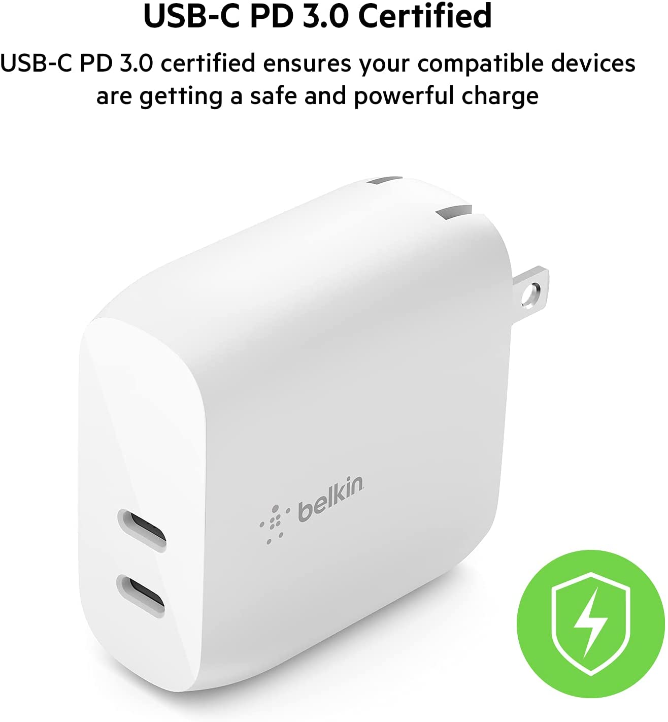Give two compatible devices a fast charge at the same time with our Dual USB-C PD Wall Charger 40W. This USB-C PD certified charger delivers 20W of power from each USB-C port, charging an iPhone 12 from 0-50% within 25 mins* and an iPad from 0-50% in 40 mins†. Plus, it’s travel-ready with its compact design and foldable prongs (US and China only), making it the perfect choice for home, the office, and on the road. Our dual-port charger is also universally compatible with the latest USB-C PD enabled smartphones and tablets—including Apple, Google, Samsung, and more—giving you a safe and fast charge for all your devices.