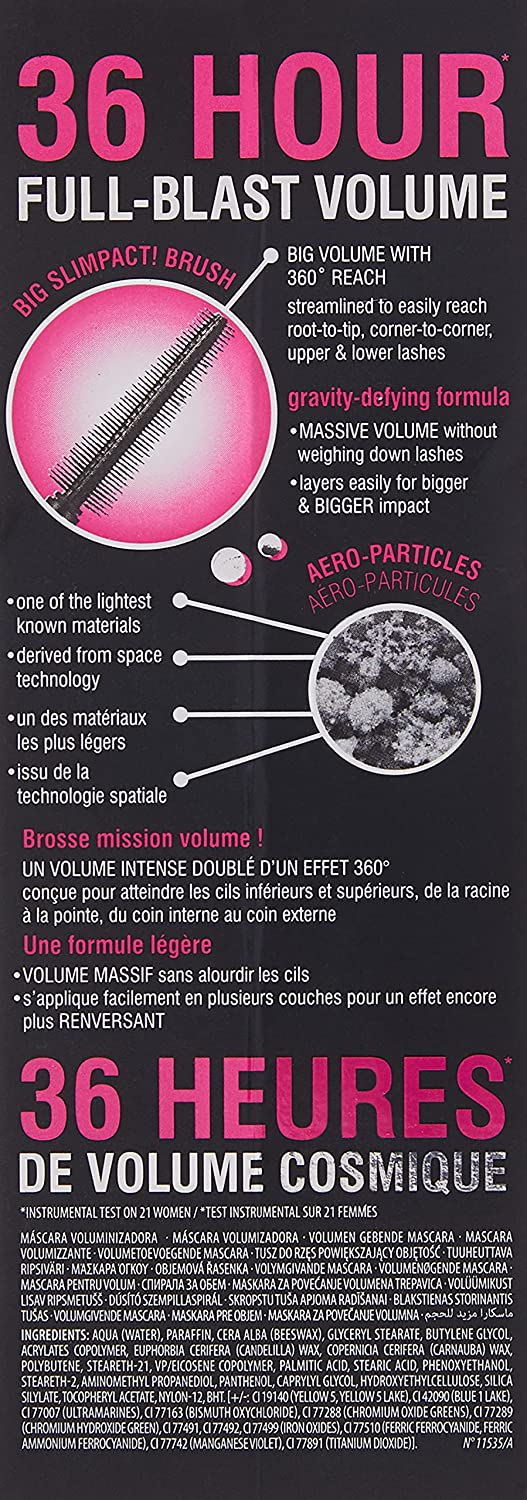 Get out-of-this-world lashes! Badgal bang! 36-Hour full-blast volumizing mascara creates massive volume without weighing down lashes! The gravity-defying formula contains aero-particles, one of the lightest known materials derived from space technology. This innovative intense pitch-black mascara layers easily for bigger impact. Its custom brush is designed to reach from root to tip and corner to corner of upper and lower lashes for big volume with 360 Degree reach!