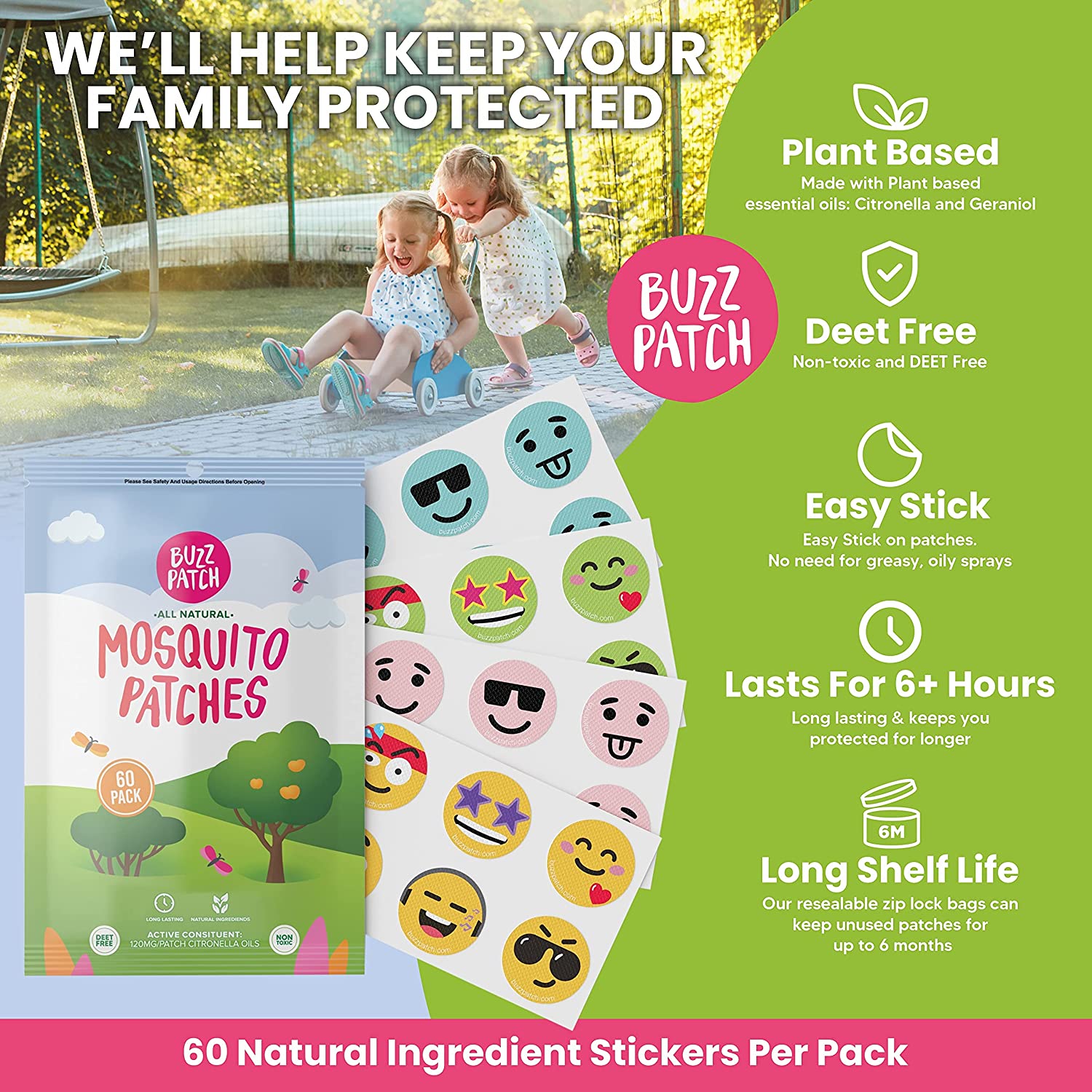 BuzzPatch Mosquito Repellant Patch Stickers for Kids (60 Pack) - All Natural, Plant Based Ingredients, Non-Toxic, DEET Free, Citronella Essential Oil Insect Patches, For Toddlers, Babies, Children (1)