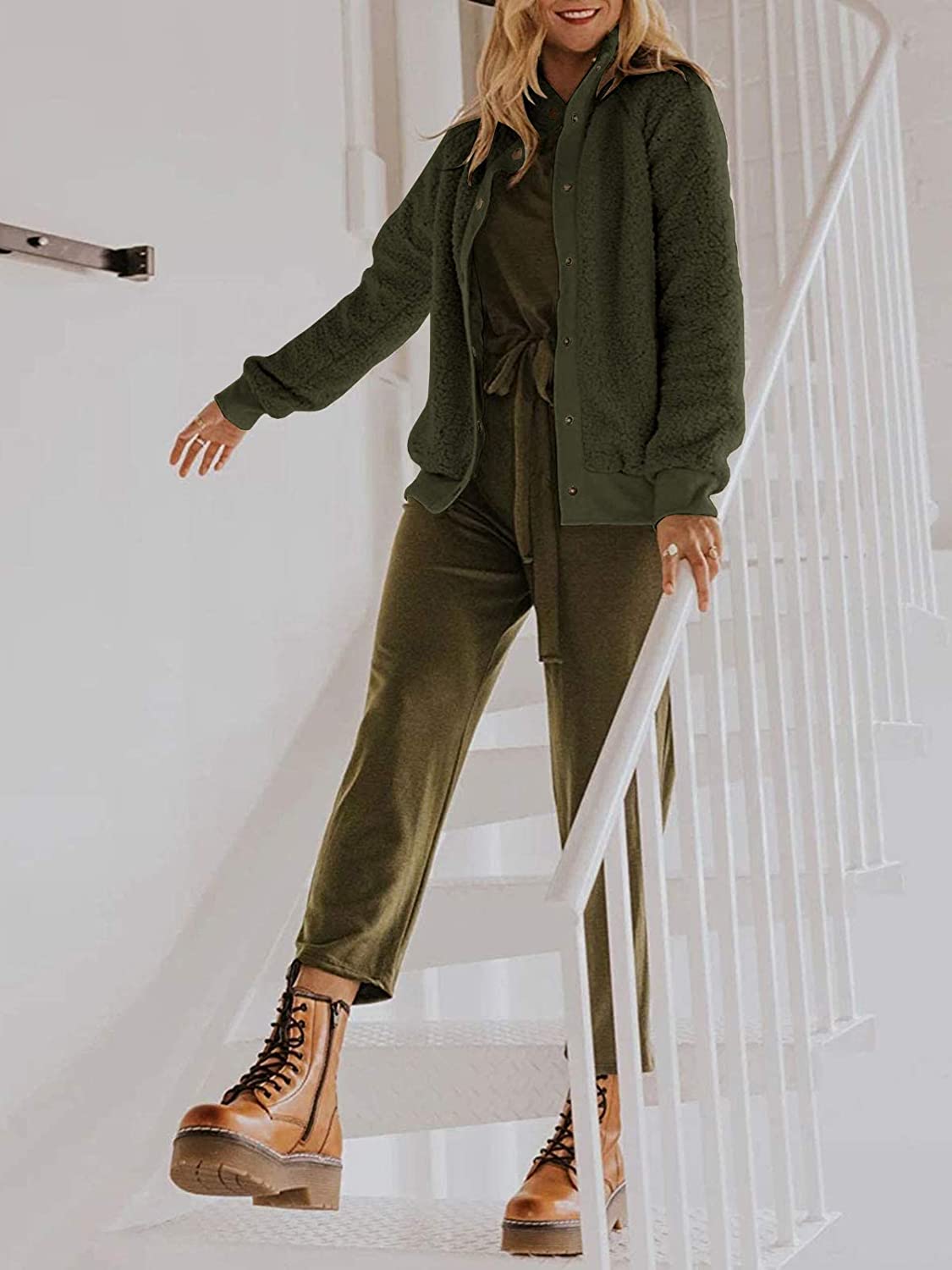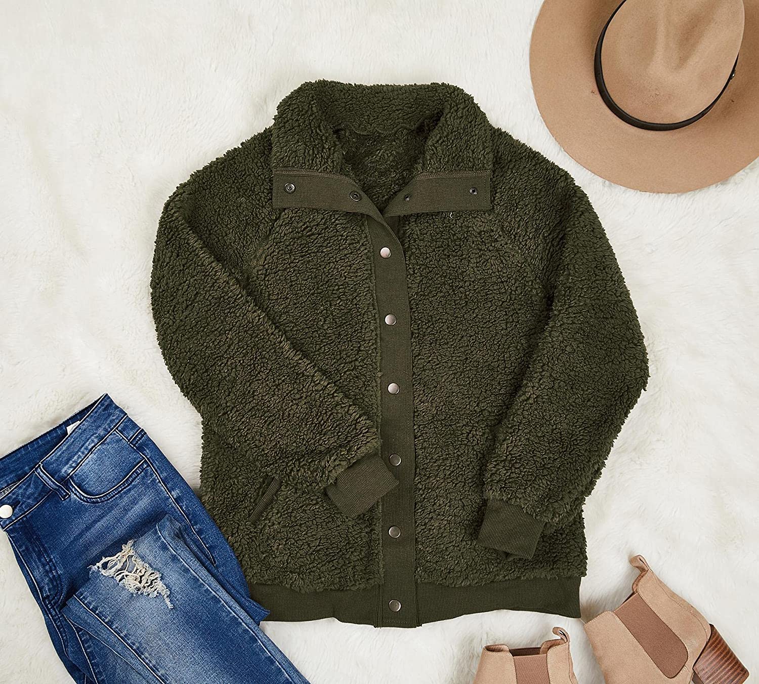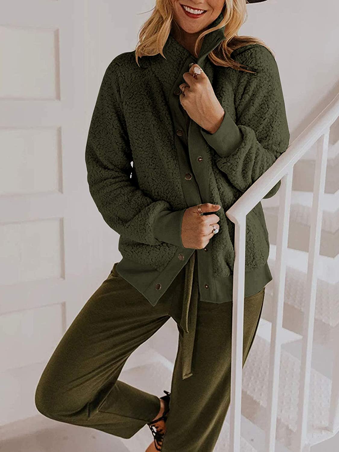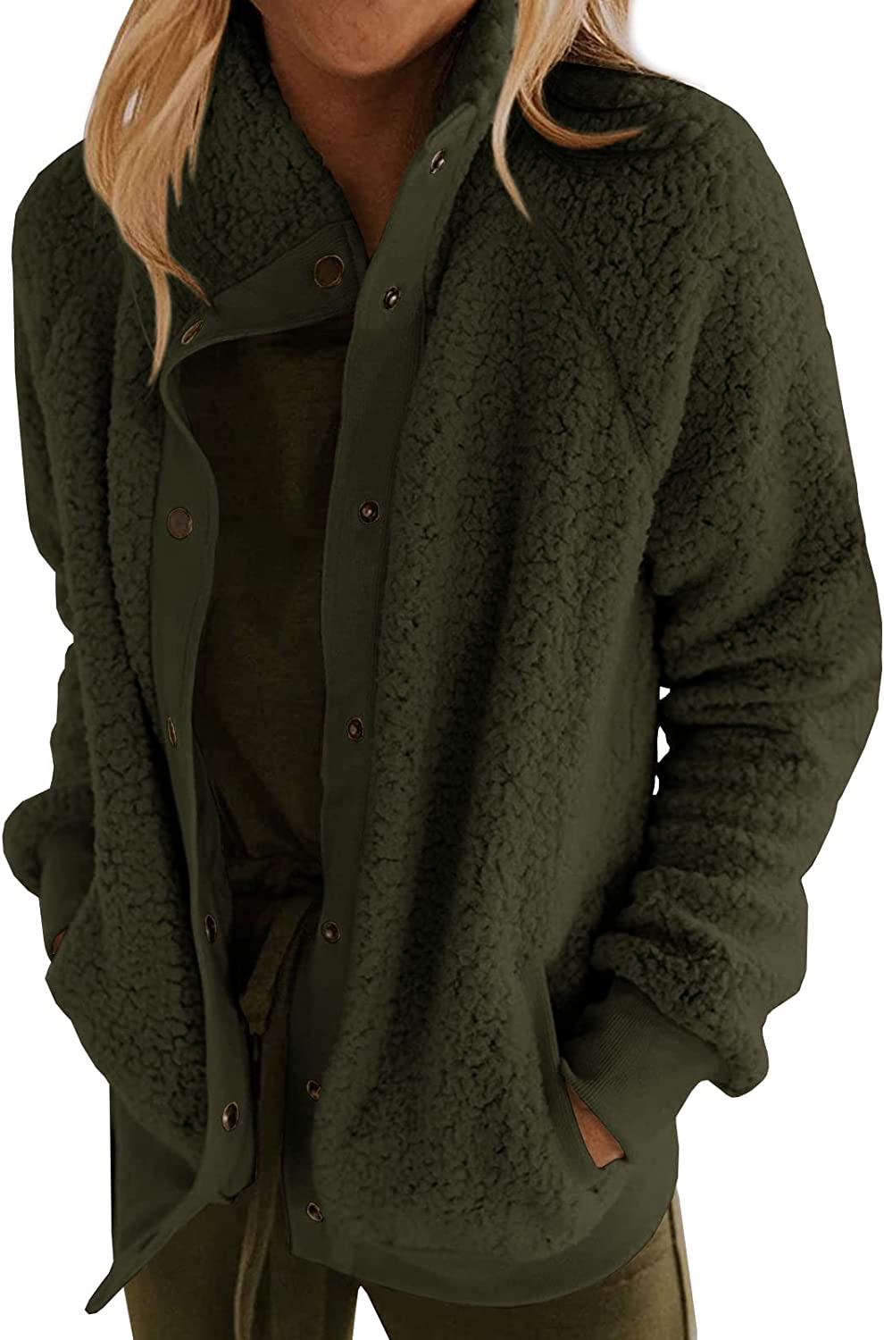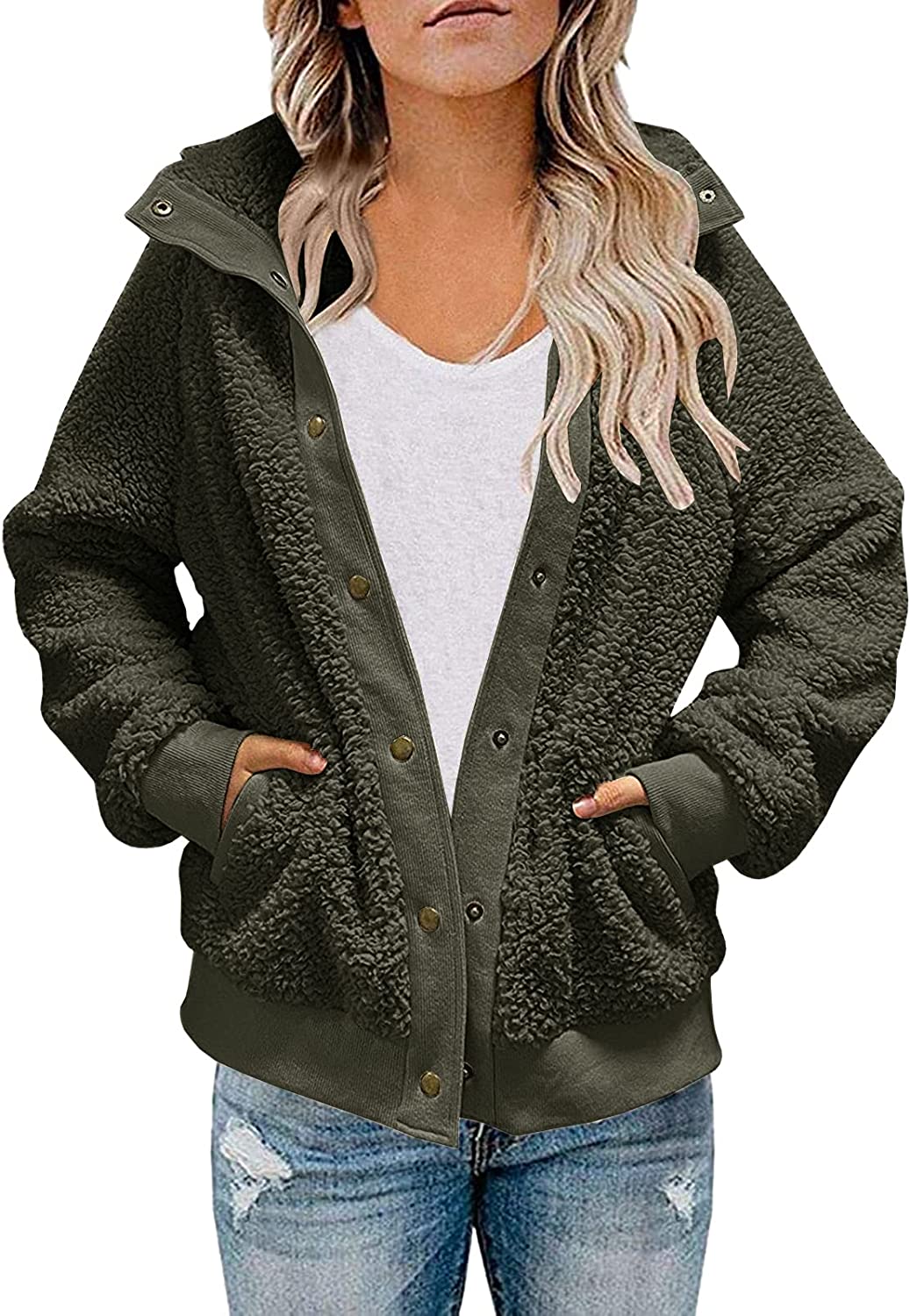 Caitefaso Women's Sherpa Fleece Jacket Warm Long Sleeve Button Down Fuzzy Faux Wool Winter Coat Outerwear With Pockets