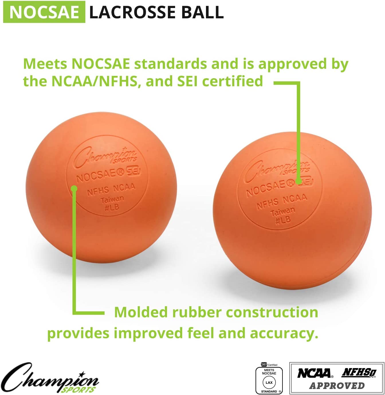 Approved for use in high school, college, and the professional ranks by the NFHS, NCAA, and NOCSAE, Champion Sports lacrosse balls are crafted from molded rubber to optimize stick handling, passing, shot accuracy, and scoring. The construction allows for pliable and responsive performance on any field.