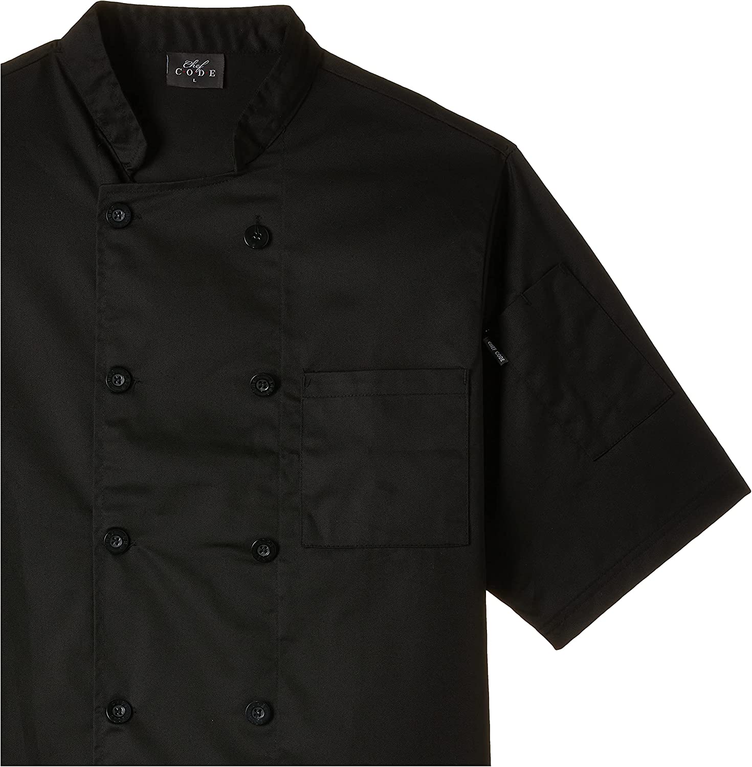 This is the short sleeve version of our pearl button classic. It is double breasted and has left chest and thermometer pockets. The fabric is 60/40 cotton-poly to help keep the heat out of the kitchen. Best outfit to keep you cool