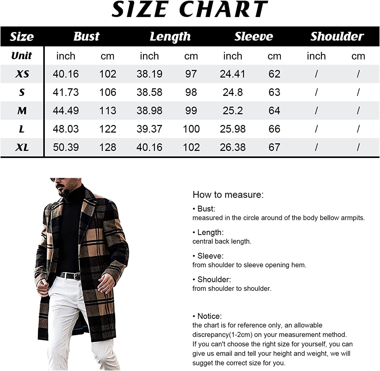 chouyatou Men's Casual Notched Collar Plaid Single Breasted Wool Blend Formal Trench Top Coat