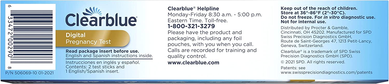 The Clearblue Digital Pregnancy Test with Smart Countdown (Prueba de embarazo Digital Clearblue con cuenta regresiva inteligente) is the only test that has a unique progress indicator that counts down to the result and gives you confidence every step of the way until your result is digitally displayed in words. The Clearblue Digital Pregnancy Test with Smart Countdown with its wide tip makes it easy to take the test accurately. The unique Floodguard Technology helps reduce the #1 reported cause of user error by over 70%(4) by keeping excess urine from flooding the test strip. The Clearblue Digital Pregnancy Test with Smart Countdown gives you accuracy and reassurance while you wait for your result.