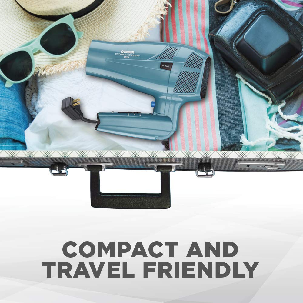 The Conair 1875 Watt Ionic Conditioning Cord-Keeper Hair Dryer with Folding Handle in Teal has a cord which retracts at the push of a button for easy storage. Keep things tidy and tangle-free with this 1875 Watt Hair Dryer. The folding handle is perfect for easy packing, compact storage and jet-setting travel. This powerful and lightweight hair dryer has Ionic Conditioning for smooth, shiny-looking hair and less frizz. The Tourmaline Ceramic Technology in this dryer for hair produces infrared heat, which gently dries hair quickly while ultimately reducing heat damage. 2 heat/speed settings for custom air flow and a Cool Shot locks style in place. In addition to the folding handle and retractable cord, this dryer is Dual Voltage, which makes this hair dryer excellent for worldwide travel. Refer instruction manual before use.