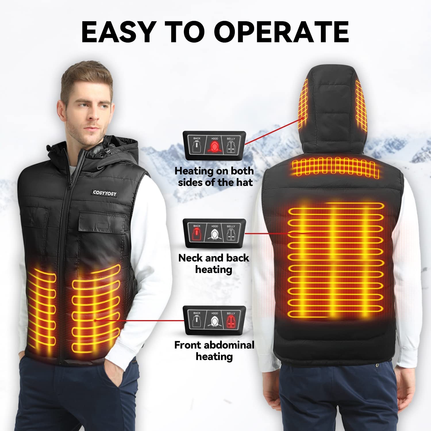 COSYYOSY Heated Vest with Hood for Men/Women, 6 Pockets, 5 Heating Panels, 3 Modes, Electric Outdoors Coat