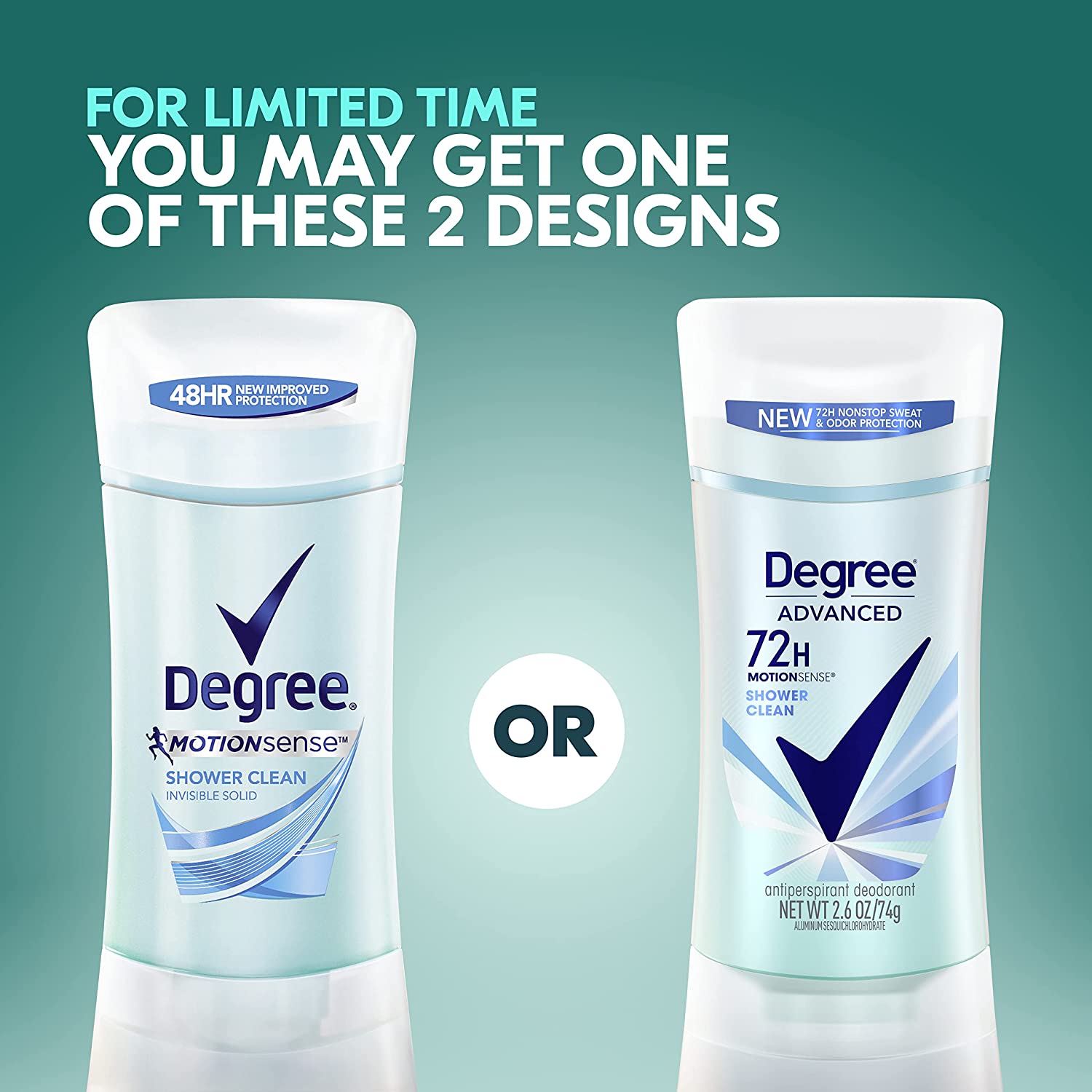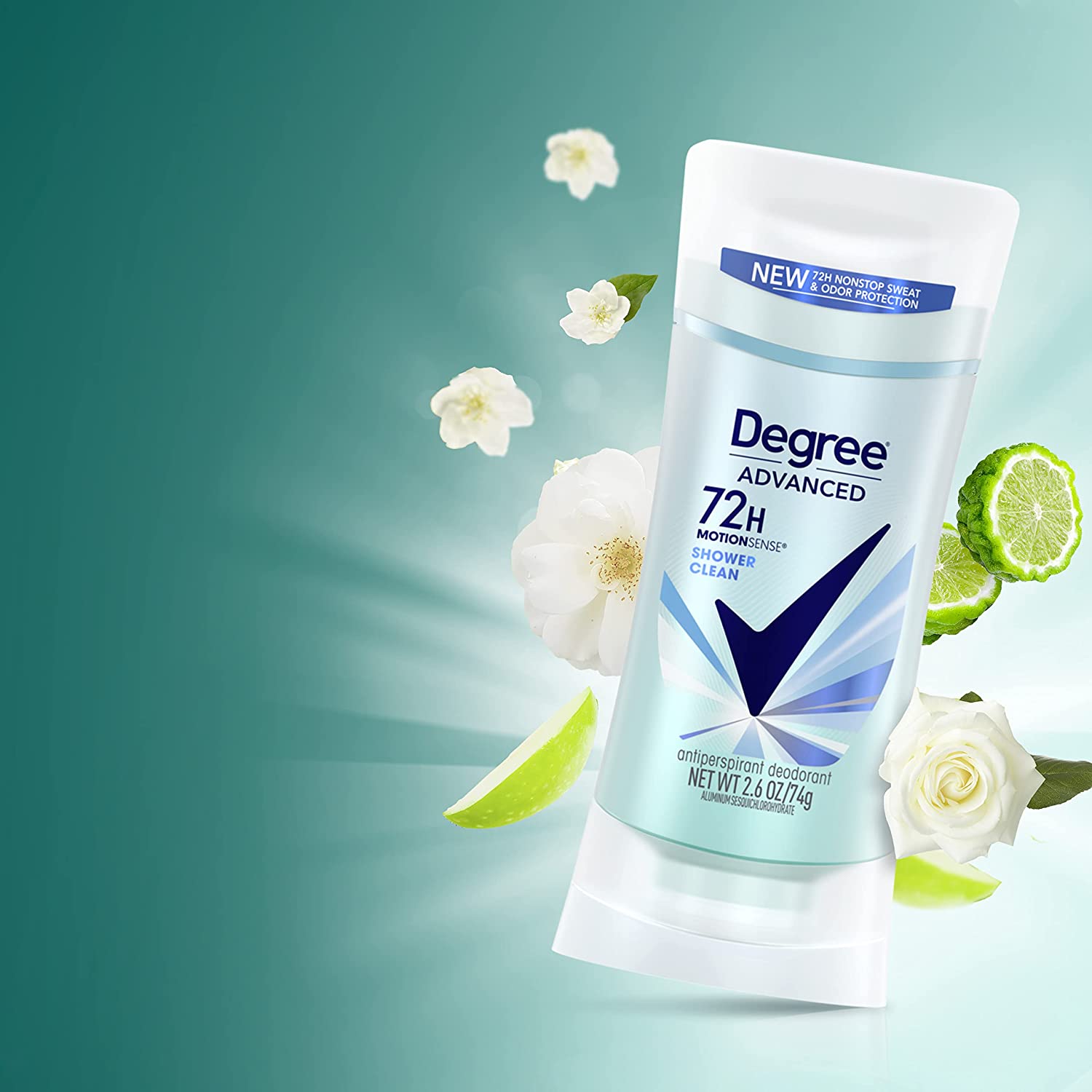 Degree is upgrading to our best formula yet. Our new and improved formulation gives you 72 hours of nonstop sweat and odor protection. You will still find all the same fragrances you know and love, but now with our new and improved long lasting protection! For a limited time, you may still receive our old 48-hour formulation while all our new 72-hour products make their way to a store near you. Degree Advanced Shower Clean Antiperspirant Deodorant delivers nonstop protection, so you can face the day with confidence. This antiperspirant for women features 72-hour sweat and odor protection and the bright floral scent of rose and jasmine, blended with delicate fruit for an invigorating, clean feeling. Only Degree has MotionSense technology that moves in sync with your body. This antiperspirant deodorant spray releases a burst of subtle fragrance every time you move, for nonstop protection. Degree Advanced Shower Clean Antiperspirant Deodorant keeps you feeling fresher, drier, and more confident. This powerful antiperspirant deodorant responds when you need it most so that you don't have to worry about slowing down. Simply swipe and start moving.