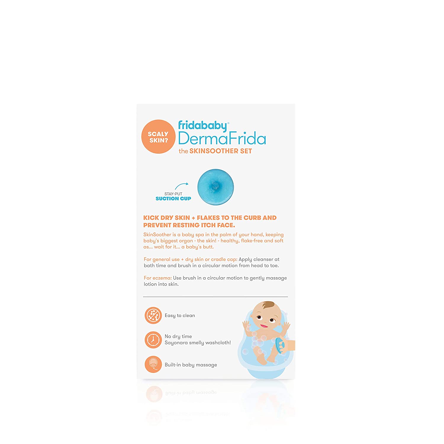 Kick dry skin + flakes to the curb and prevent resting itch face. SkinSoother is a baby spa in the palm of your hand, keeping baby's biggest organ- the skin, healthy, flake-free and soft. For general use and dry skin- apply cleanser at bath time and brush in a circular motion from head to toe. For eczema- use the brush in a circular motion to gently massage lotion into skin.
