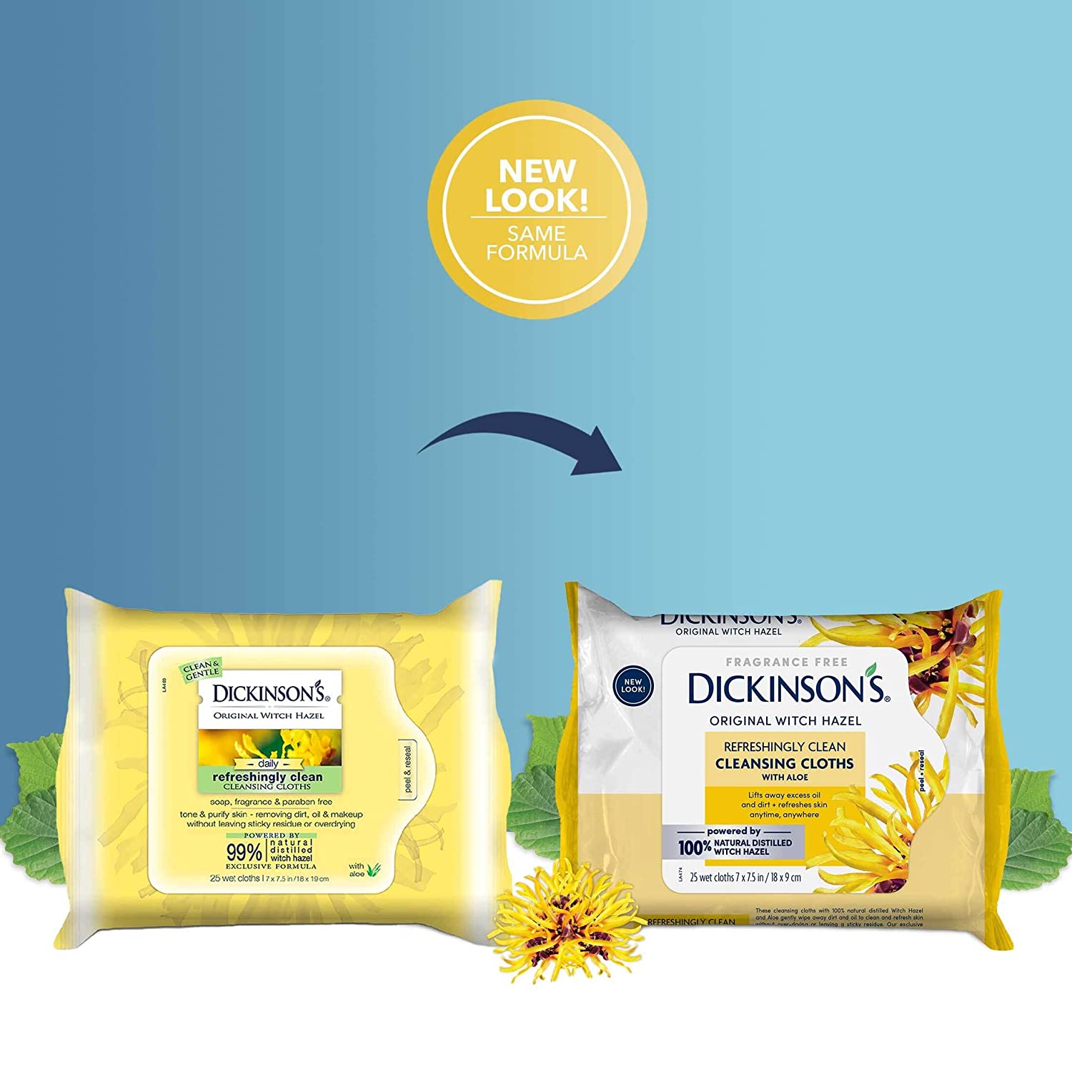 Dickinson's Original Refreshingly Clean Daily Cleansing Cloths combine a soothing blend of witch hazel, aloe, and botanical extracts for a clean, balanced, and blemish-free complexion. Our exclusive formula is 99% natural and succeeds by gently lifting dirt, oil, and makeup from even the most sensitive of skin, all without leaving sticky residue or overdrying. This order includes a package of 25 extra-large, extra-soft cloths. For more than 150 years, natural witch hazel has been the primary ingredient in all of Dickinson's products for truly effective skincare solutions. They'll help to leave your skin feeling healthy and hydrated (and without harsh or confusing ingredients). Only the pure essence of peak-bloom, hand-harvested, and organic-certified New England witch hazel makes its way into our products. Dickinson's also leaves a positive impact on the environment, all while offering products which gently cleanse, tone, and refresh to purify all skin types. A pure clean for a pure, beautiful you: that is the genuine promise of Dickinson's.