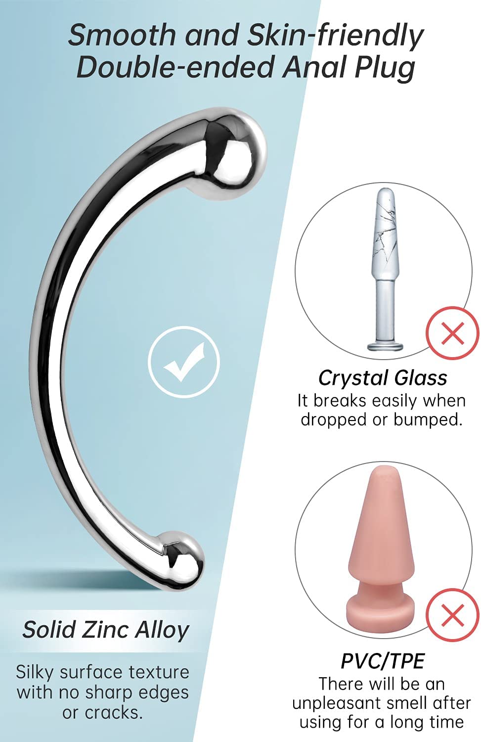 Double-Ended Dildo G-spot Massage Anal Plug Stimulate Wand Fetish Dildo Solid Metal Curved Dual Ended Masturbation Sex Toy for Couple Romi