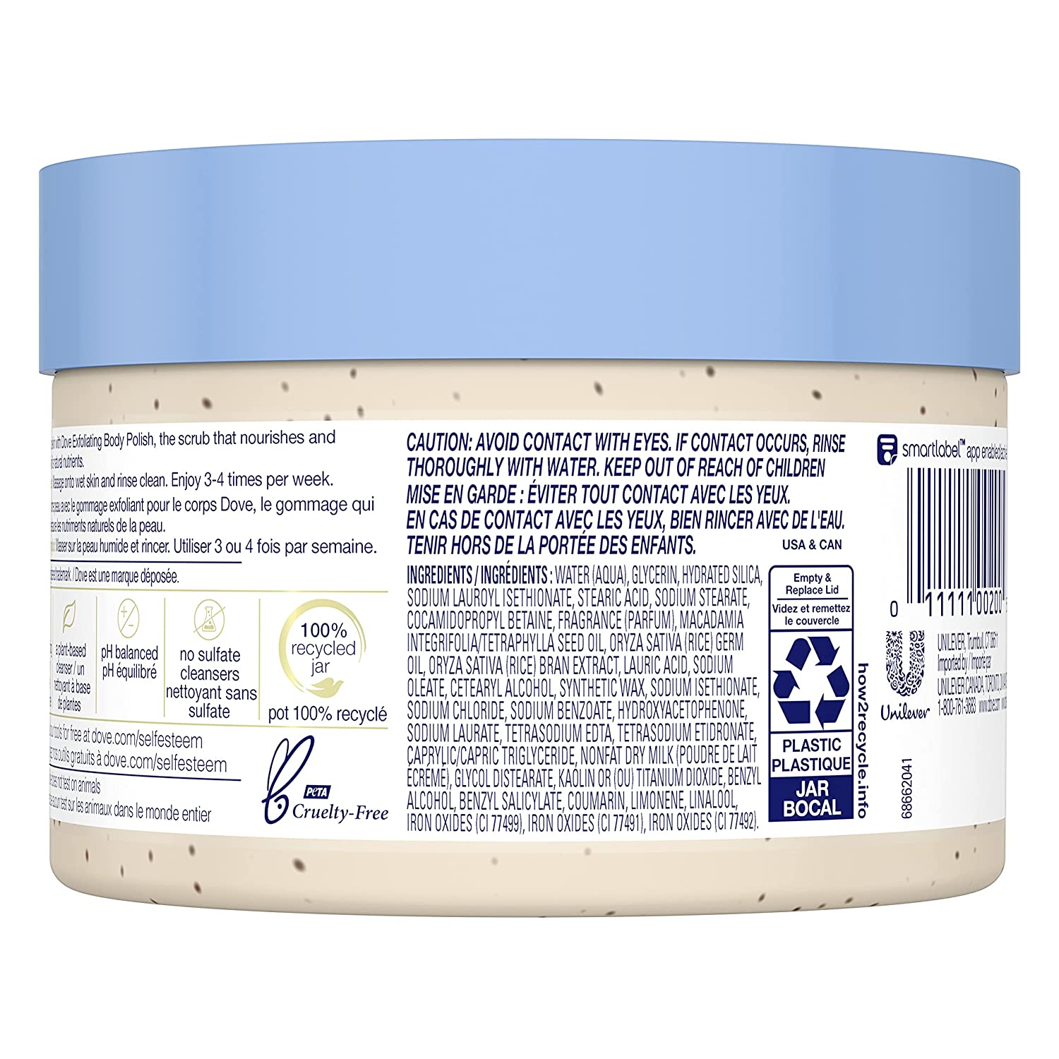 There’s one essential step for achieving smooth skin that shouldn’t be overlooked: exfoliation. So, gently buff away dry, dull skin while caring for your skin with Dove Macadamia and Rice Milk Exfoliating Body Polish. Made with ¼ moisturizing cream, this gentle exfoliating body scrub restores skin’s nutrients as it exfoliates, leaving your skin feeling silky smooth. With a smooth, easily spreadable texture, this Dove body exfoliator gives you beautifully creamy coverage while releasing a gently herbal and floral hypoallergenic fragrance. Get all the effectiveness you’d look for in exfoliators or a shower scrub, but with the nourishment and care that your skin needs in the shower. To use, scoop a generous amount of Dove Macadamia and Rice Milk Exfoliating Body Scrub out of the jar. Massage all over your body in circular motions for creamy coverage, and then rinse away to reveal silky smooth skin. Use 3-4 times per week as part of your skin care regimen, followed by Dove Body Wash or Beauty Bar for touchably soft skin. Try Dove Body Polish to get beach-ready skin, prep skin for tanning, or to help exfoliate before shaving to help prevent ingrown hairs. You'll love the feeling of silky smooth skin all over. Plus, when you buy Dove, you can be assured you’re caring for your skin with products that are PETA Cruelty-Free certified.