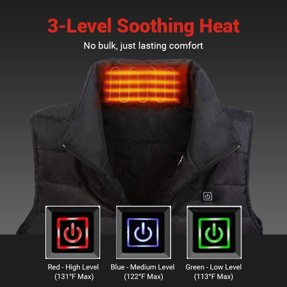 For a combination of functional comfort and quilted design, reach for the Sleeveless Quilted Heated Vest from Dr. Prepare, this unisex heated vest helps you stay cozy and warm. Operation: ※ Please use a portable battery pack (not included) with 2A or 2.4A USB output to power up this heated vest. ※ Step 1. Unzip the inner pocket and take out the USB cable. Step 2. Insert the USB cable into the USB output on the battery. Then push the Power Button on your battery pack to turn it on. The thermal switch on the vest (near your chest) now cycles through red, blue, and green light for once, indicating the heated vest is plugged in. Step 3. Long press the thermal switch for 2 seconds and it will flash red light. The heated vest will enter the AUTO Mode. In AUTO Mode, the temperature of your heated vest will regulate from High to Medium after the red light flashes for 5 minutes. Step 4. If you prefer a certain heating level to the AUTO mode, short press the thermal switch. Then you can adjust temperature settings from High, Medium to Low. The red light stands for high heat. The blue light indicates medium heat and the green light signals low heat. Step 5. Press and hold the thermal switch for 2 seconds to stop the heated vest from heating. Specifications: Name: Heated Vest Input: 5V / 1.9A Rated Wattage: 9.5W Outer Shell: 100% Polyester Filling: 100% Polyester Three Heating Levels: 131°F (High, Red Light), 122°F (Medium, Blue Light) 113°F (Low, Green Light)