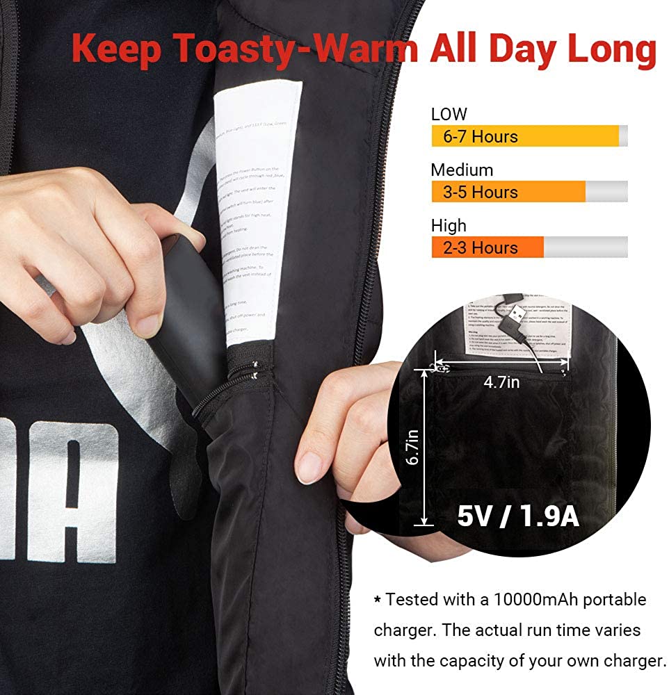 For a combination of functional comfort and quilted design, reach for the Sleeveless Quilted Heated Vest from Dr. Prepare, this unisex heated vest helps you stay cozy and warm. Operation: ※ Please use a portable battery pack (not included) with 2A or 2.4A USB output to power up this heated vest. ※ Step 1. Unzip the inner pocket and take out the USB cable. Step 2. Insert the USB cable into the USB output on the battery. Then push the Power Button on your battery pack to turn it on. The thermal switch on the vest (near your chest) now cycles through red, blue, and green light for once, indicating the heated vest is plugged in. Step 3. Long press the thermal switch for 2 seconds and it will flash red light. The heated vest will enter the AUTO Mode. In AUTO Mode, the temperature of your heated vest will regulate from High to Medium after the red light flashes for 5 minutes. Step 4. If you prefer a certain heating level to the AUTO mode, short press the thermal switch. Then you can adjust temperature settings from High, Medium to Low. The red light stands for high heat. The blue light indicates medium heat and the green light signals low heat. Step 5. Press and hold the thermal switch for 2 seconds to stop the heated vest from heating. Specifications: Name: Heated Vest Input: 5V / 1.9A Rated Wattage: 9.5W Outer Shell: 100% Polyester Filling: 100% Polyester Three Heating Levels: 131°F (High, Red Light), 122°F (Medium, Blue Light) 113°F (Low, Green Light)