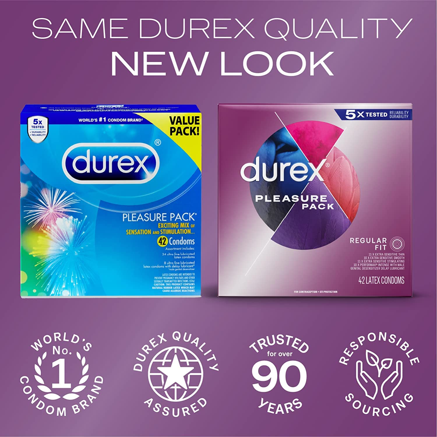 Durex Pleasure Pack Assorted Condoms features 4 types of assorted lubricated, natural latex male condoms including Extra Sensitive condoms & Performax Intense ribbed and dotted condoms. Durex Performax Intense delay condoms for men are made with a desensitizing lubricant to help slow him down and last longer, Benzocaine (5 percent). Durex Extra Sensitive ultra thin condoms with extra lubrication give you the intimate feeling of skin on skin contact. REGULAR FIT: Our standard girth, regular fit condoms are designed for a close and comfortable fit, with a nominal width of 54mm. FSA (Flexible Spending Account) and HSA (Health Savings Account) eligible. Durex is the world's #1 condom brand* trusted over 80 years. Each Durex condom for men is 100 percent electronically tested for strength, flexibility and reliability and features a pleasant scent. Our products are delivered in discreet packaging with no indication of parcel contents. For maximum benefit, carefully follow the condom instructions on the inner side of this package. It helps provide protection against pregnancy, HIV/AIDS and other sexually transmitted infections (STIs). *Based on global Nielsen unit sales data through September 2020.