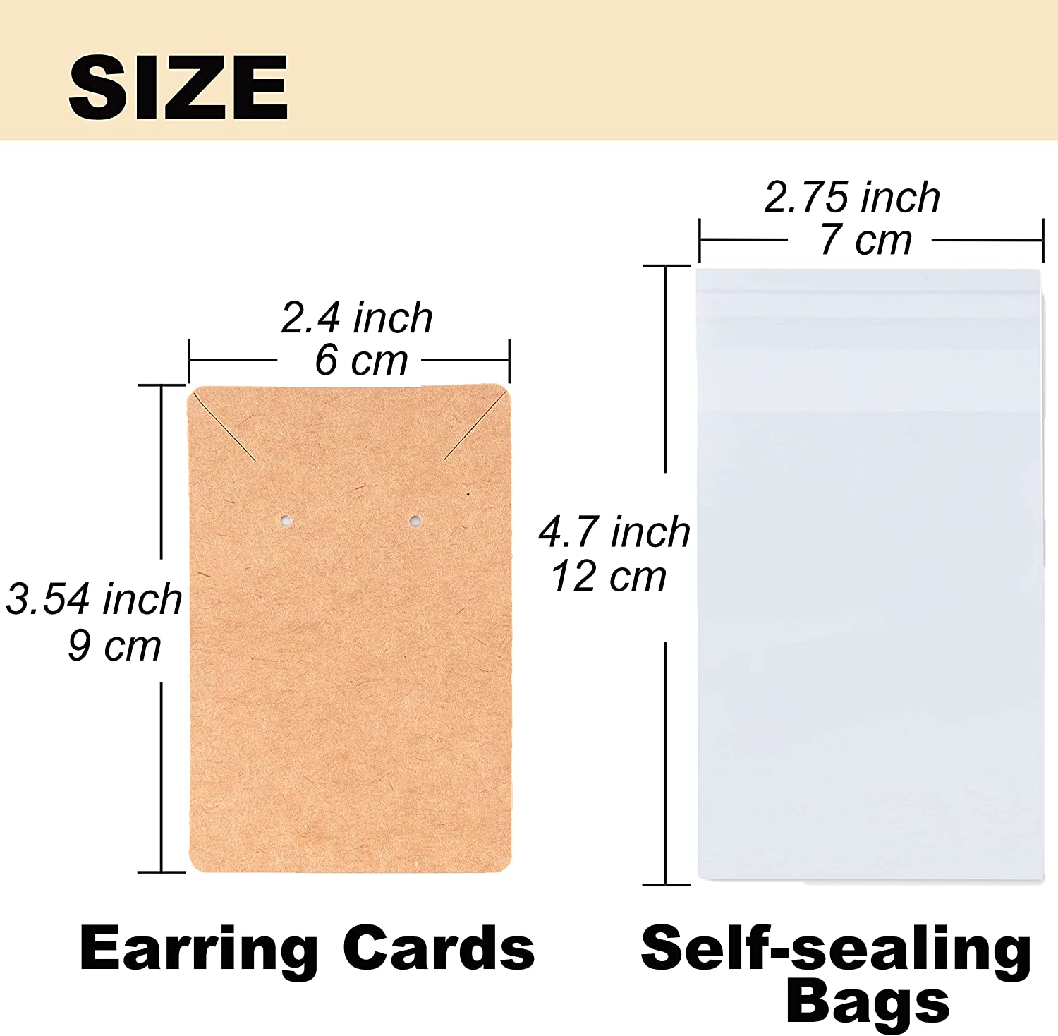 SIZE: Paper earring display cards size:3.54*2.4 inch. Jewelry bags for packaging size:4.7*2.75 inch. Earring backs size:0.15*0.2 inch.
