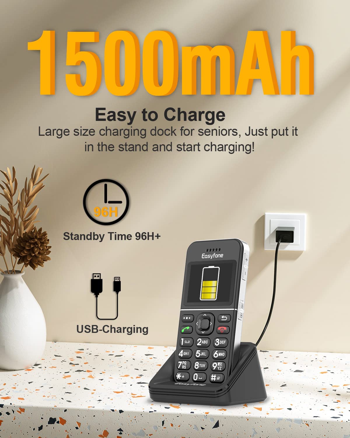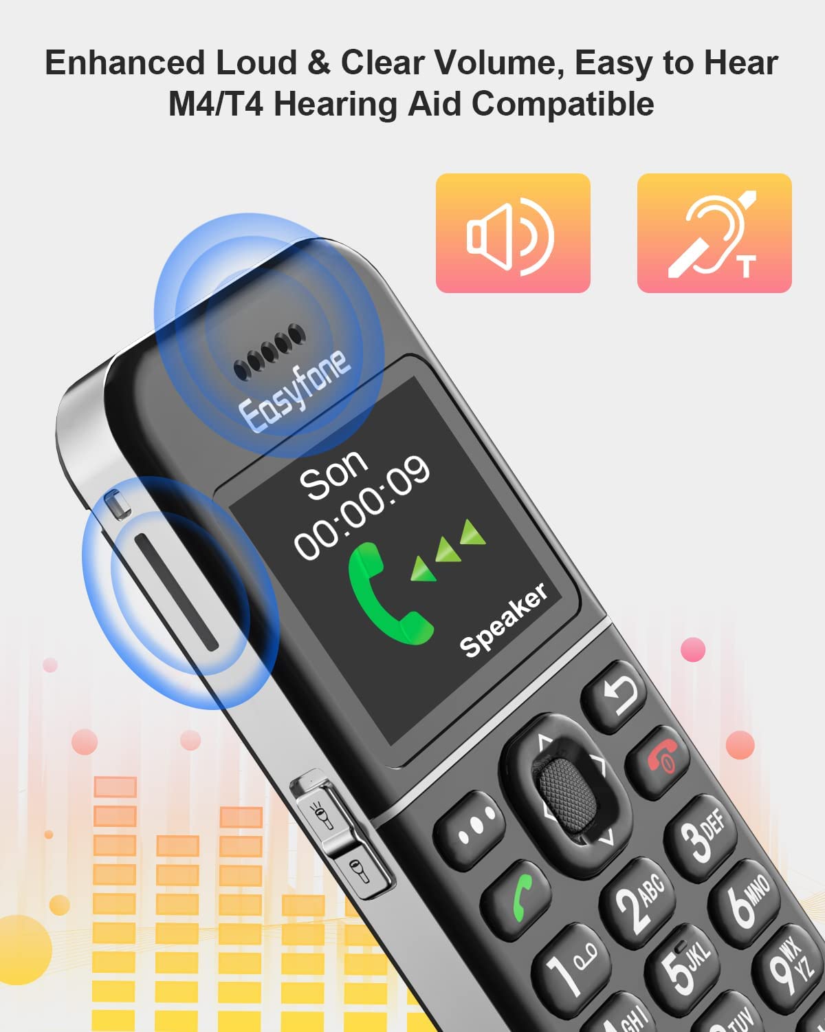 Easyfone T100 4G LTE Unlocked Big Button Senior Cell Phone, SOS Button with GPS, Hearing Aid Compatible, 1500mAh Battery with Easy to Use Charging Cradle, FCC Certified.