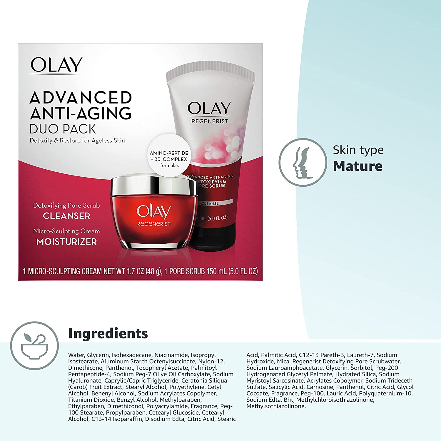 The perfect gift or stocking stuffer for the holiday season! The perfect gift or stocking stuffer for the holiday season! Ready to give as a Valentines gift or to treat yourself to a rejuvenating spa-like treatment at home, this duo pack is invigorated with two anti-aging powerhouses in one set. Our Olay Regenerist Detoxifying Pore Scrub Cleanser and Olay Regenerist Micro-Sculpting Cream help provide visible results for brighter skin and reduced appearance of wrinkles starting on day 1. The anti-aging face cleanser with exfoliants deep cleans and gently exfoliates dead skin cells for spa-like prep for daily skincare. Skin is immediately smooth and refreshed. Micro-sculpting cream completes the treatment with a unique, moisture-binding formula with Amino-Peptide Complex II that instantly plumps and lifts skin cells. The advanced formula delivers anti-aging ingredients 10 layers deep into the skin's surface to correct the look of deep wrinkles and improve skin's texture and elasticity. It's the perfect way to achieve fully hydrated, ageless skin.