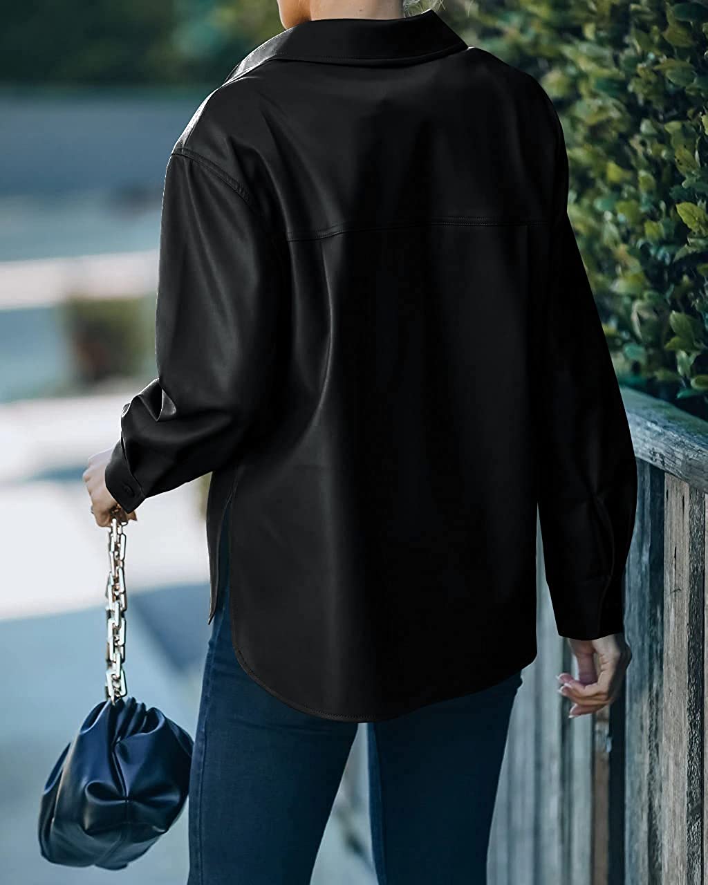 FERNGIRL Womens Button Front Faux PU Leather Jacket Shacket Casual Shirt Long Sleeve Blazer Coat with Bust Pocket