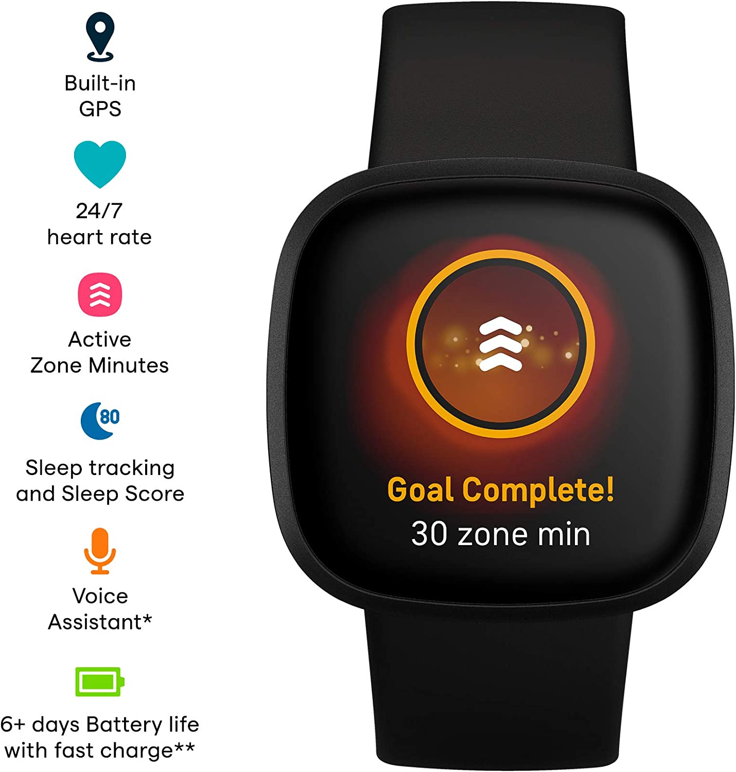 Fitbit Versa 3 Health & Fitness Smartwatch with GPS, 24/7 Heart Rate, Alexa Built-in, 6+ Days Battery, Black/Black, One Size (S & L Bands Included)