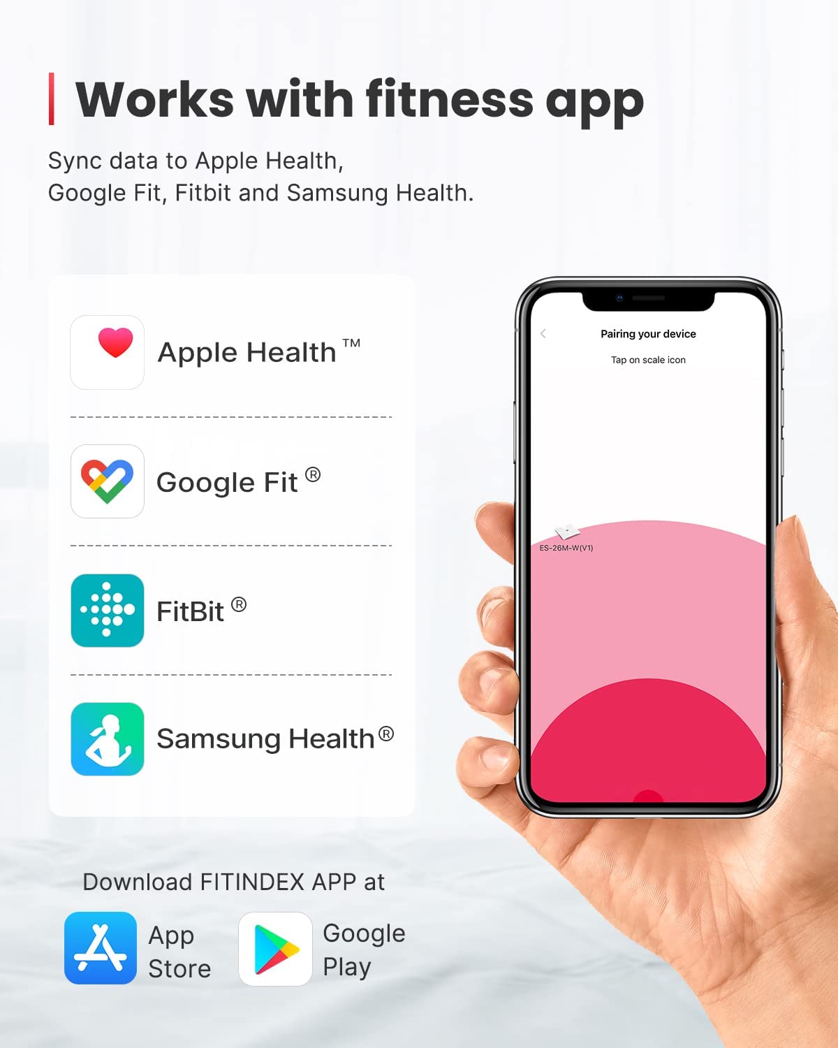 FITINDEX Bluetooth Body Fat Scale, Smart Wireless BMI Bathroom Weight Scale Body Composition Monitor Health Analyzer with Smartphone App for Body Weight, Fat, Water, BMI, BMR, Muscle Mass - White