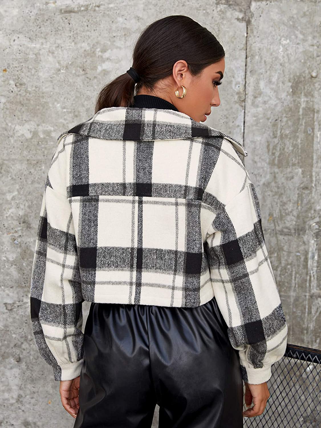 Floerns Women's Buffalo Plaid Button Front Patch Pocket Crop Jacket Coat