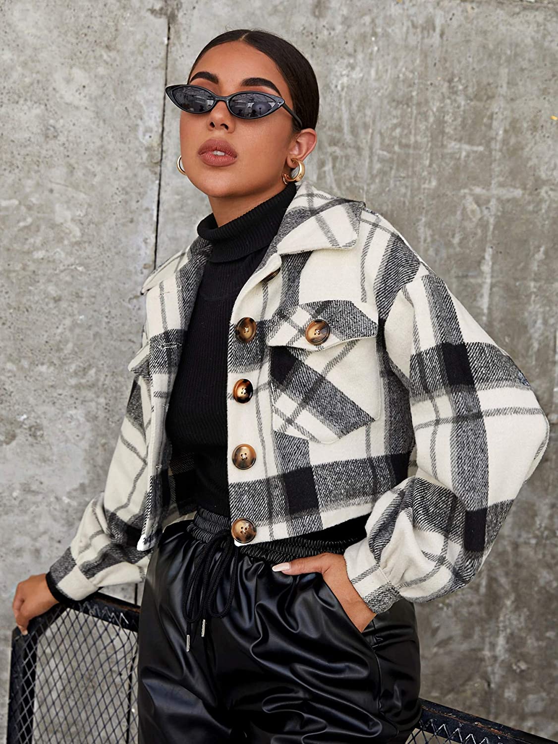 Floerns Women's Buffalo Plaid Button Front Patch Pocket Crop Jacket Coat