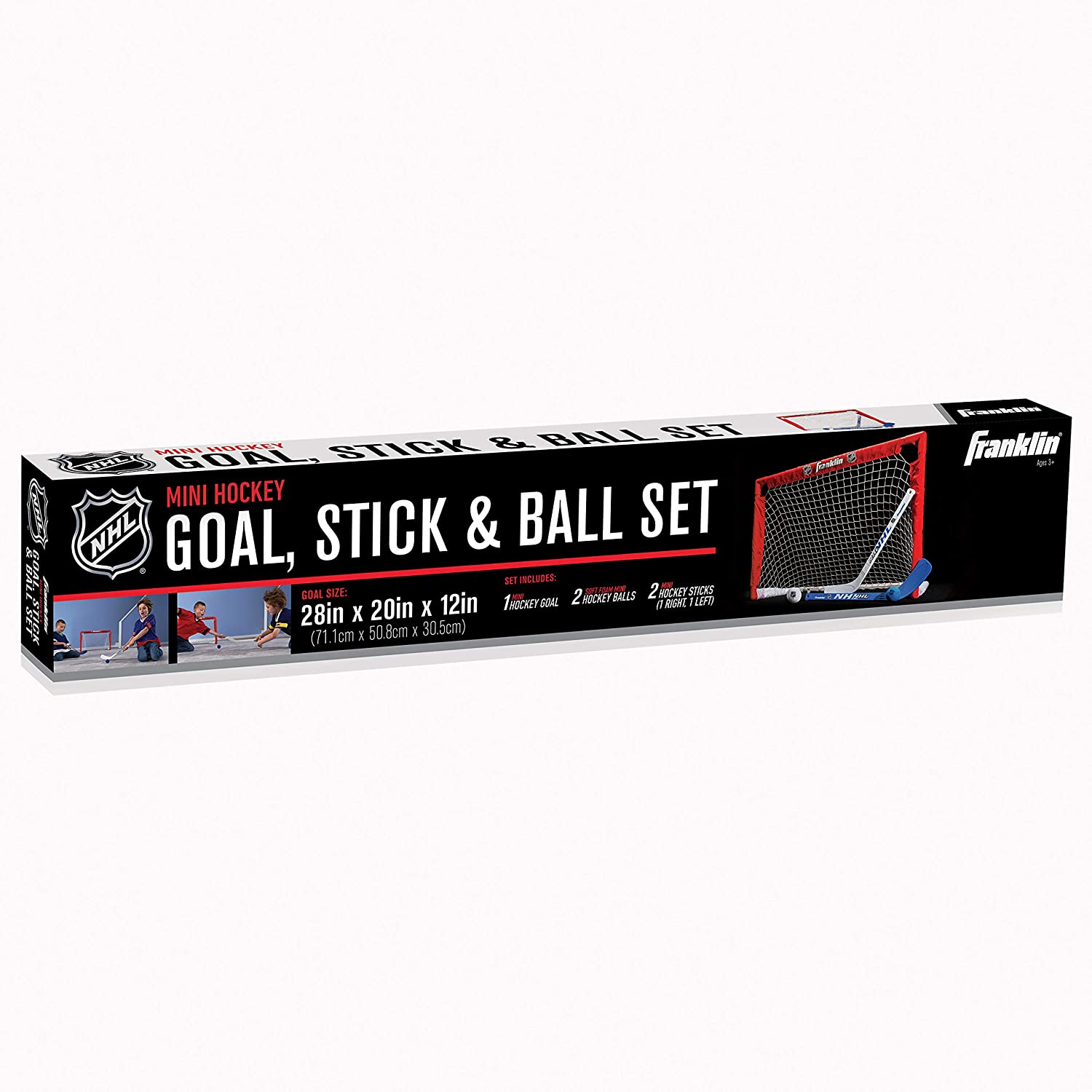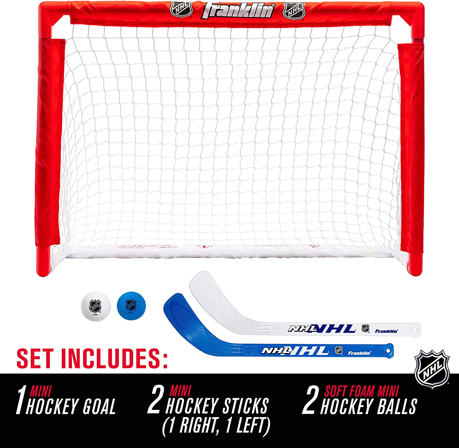 Introduce your young player to all the fun and action of Hockey with the Franklin NHL Mini Goal, Stick and Ball set. The mini goal features rugged high-impact 1.25" plastic tubing and a durable all-weather 420 denier nylon net. Includes 2 mini sticks and 2-2" foam Hockey balls. Easy to assemble and durable for years of fun for your Hockey fans. This mini Hockey set is a fun, durable way to introduce young players to the game. Measuring 28-by-16-inches (W x H) and featuring high-impact 1.25-inches plastic tubing, the goal assembles in minutes with precision-fit couplings that provide rigid durability. A durable, 900-denier all-weather polyester net with 420-denier nylon sleeve will hold up to years of heavy use. The set comes complete with two 18-inches mini-sticks and two soft EVA foam mini balls.