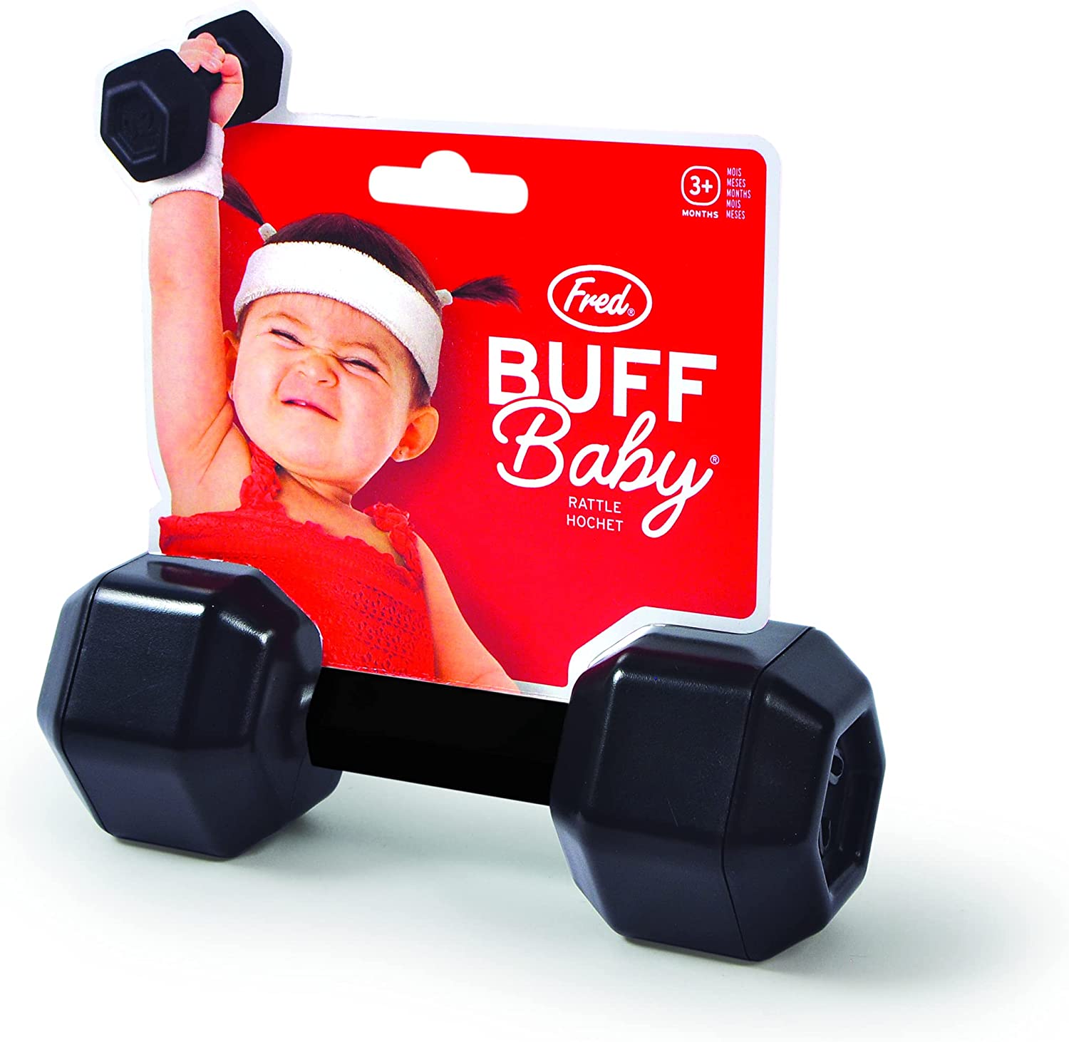 Buff Baby turns Junior into a bench-pressin’ body-builder! Your little one's curiosity will be piqued by the gentle rattle sound and natural hand-grips, while your sense of irony will be satisfied by watching Junior do 3 sets of 10. Sowork it, baby! 5 1/2" X 2", No phthalates, no BPA, safe for baby. Clear gift box packaging. Design by Diana change