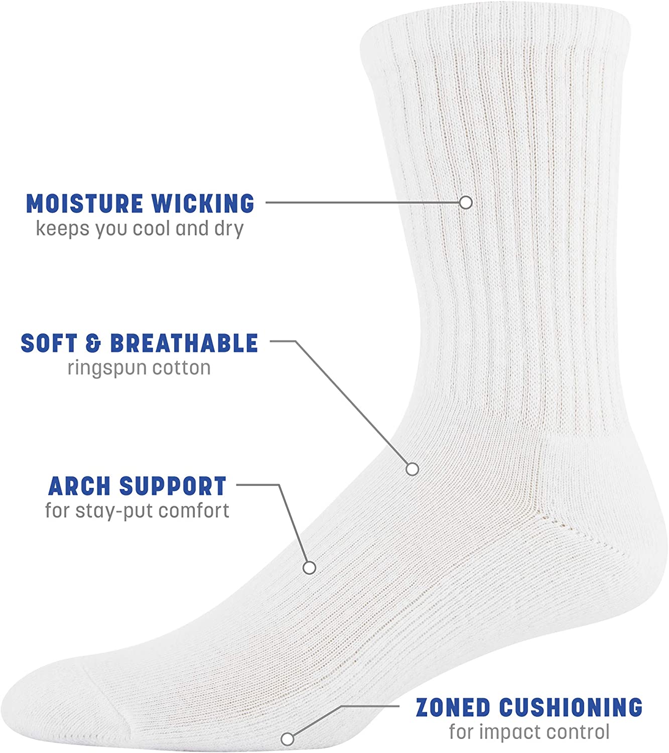 Hit your stride in style and comfort with the GILDAN Active Collection. Knit with soft, breathable ringspun cotton, these Cotton Crew Socks are engineered with zoned cushioning for impact control, arch support, and moisture wicking technology to keep you cool and dry whether you're running to a meeting or on the treadmill.