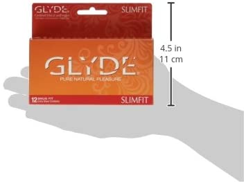 The smallest condom on the market GLYDE SLIMFIT condoms are designed for men who prefer a snugger fit, or require a narrower, tighter condom. GLYDE SLIMFIT are sized at 49mm for a form-fitting ultra reliable, ultra sensitive experience - feels great for both partners! Lightly lubricated with reservoir tip. All GLYDE condoms are made from 100% natural latex Fair Trade sourced rubber and thistle extract . Certified ethical and vegan by the Vegan Society, GLYDE condoms are free of animal testing and animal by-products, chemicals, parabens, or spermicides. Each condom is double washed to eliminate odor, and features patented technology for strength and durability which exceeds global standards. GLYDE SLIMFIT is available in packs of 12, 36 or 100. Distributed by GLYDE America.