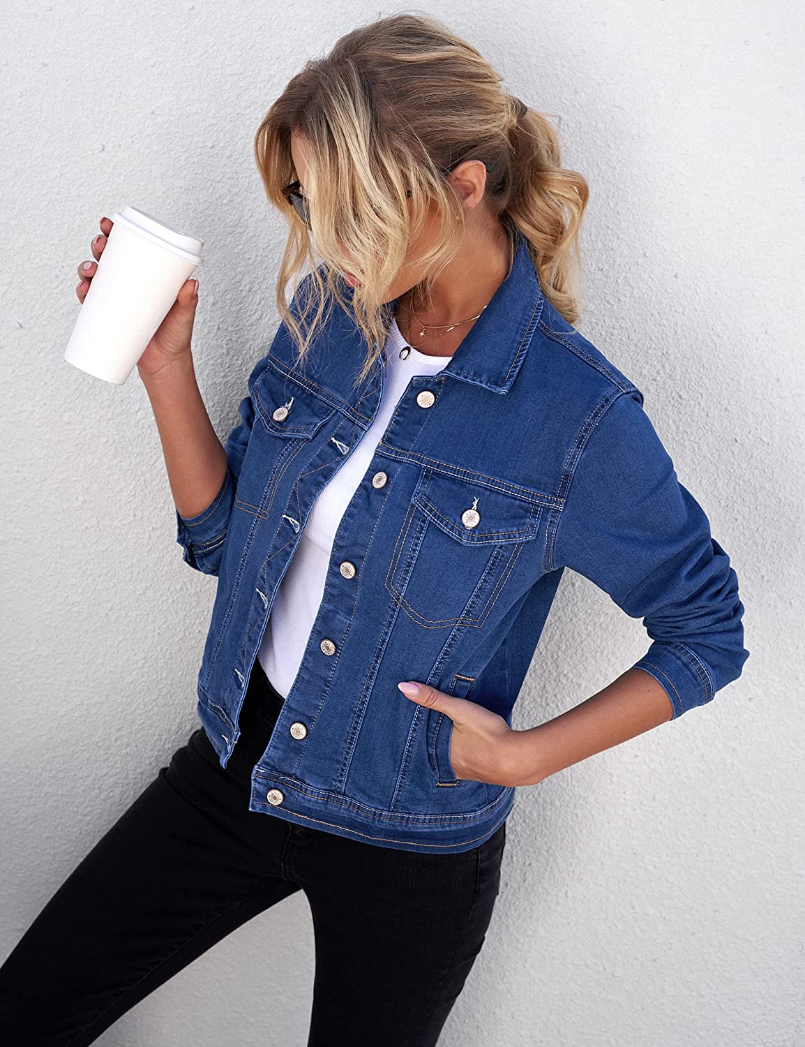 GRAPENT Women's Basic Button Down Long Sleeve Stretchy Jean Trucker Denim Jacket