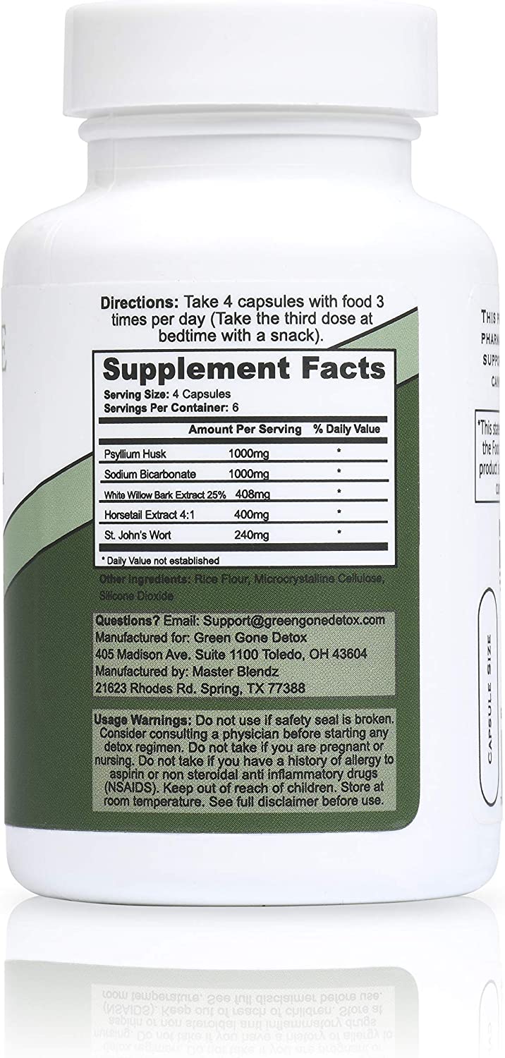 All natural 2 day detox designed by pharmacists. The detox is made from 5 ingredients: St John Wort, Sodium Bicarb, White Willow Extract, Horsetail Extract, and Psyllium Husk.