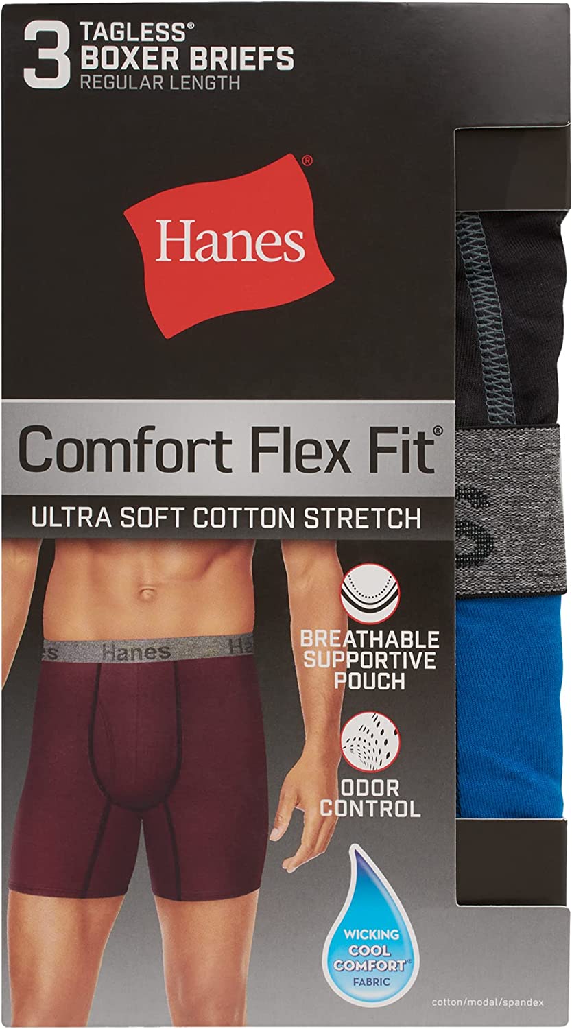 Hanes®men's boxer briefs are made from a high-quality cotton-stretch blend that's moisture-wicking and smell-resistant to help keep you cool during workouts and beyond. Our experts designed them with a support pouch and ComfortFlex Fit® waistband that averts your men's underwear from pinching and binding. This men's boxer brief underwear is available in multiple size and leg options that won't ride up, so you can choose the one that works best for you