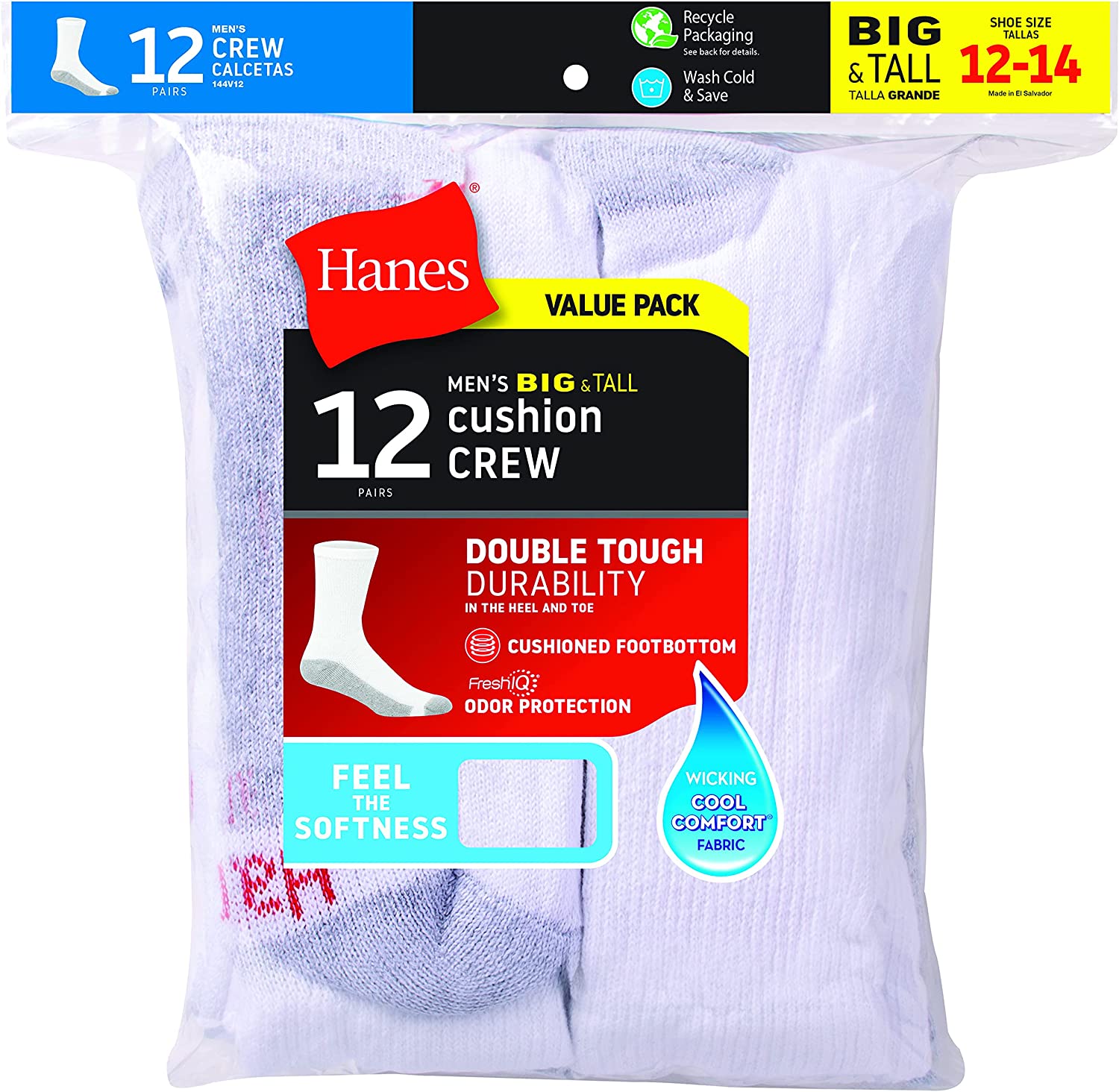 Hanes Men's Double Tough Crew socks pack a powerful punch with Double Tough durability and full cushioning around the foot of the sock for maximum comfort. Wicking Cool Comfort fabric helps keep your feet cool and dry. Our FreshIQ Advanced Odor Protection will help fight those stinky feet! Spandex is knit into the sock to help provide a better fit and our Comfort Toe Seam provides additional comfort.