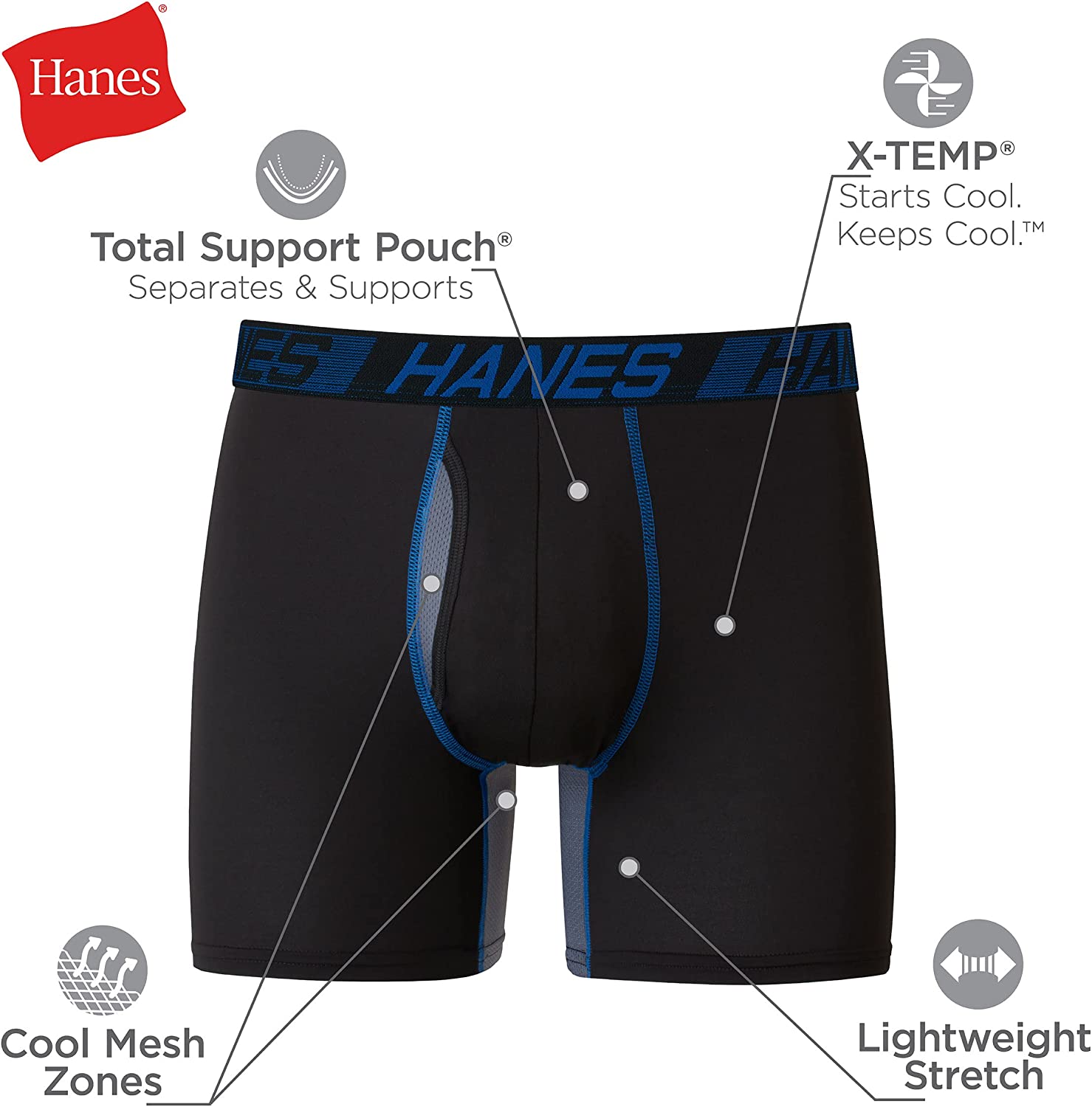 This Hanes® Total Support Pouch™ sexy men's underwear pack is one of our most comfortable styles yet, thanks to its anti-chafing design and X-Temp™ cooling technology that starts cool and stays cool. The patented breathable mesh liner helps prevent chafing by separating and supporting while the lightweight stretch fabric moves with you. These quick-dry moisture-wicking underwear also have advanced odor control, so you stay fresh and dry, no matter what your day brings. And the best part of all? This men's boxers pack comes in your choice of regular Boxer Briefs, Long-Leg Boxer Briefs, or Men's Trunk Underwear, so you can choose which style works best for you. Note: Colors/patterns may vary depending on availability.