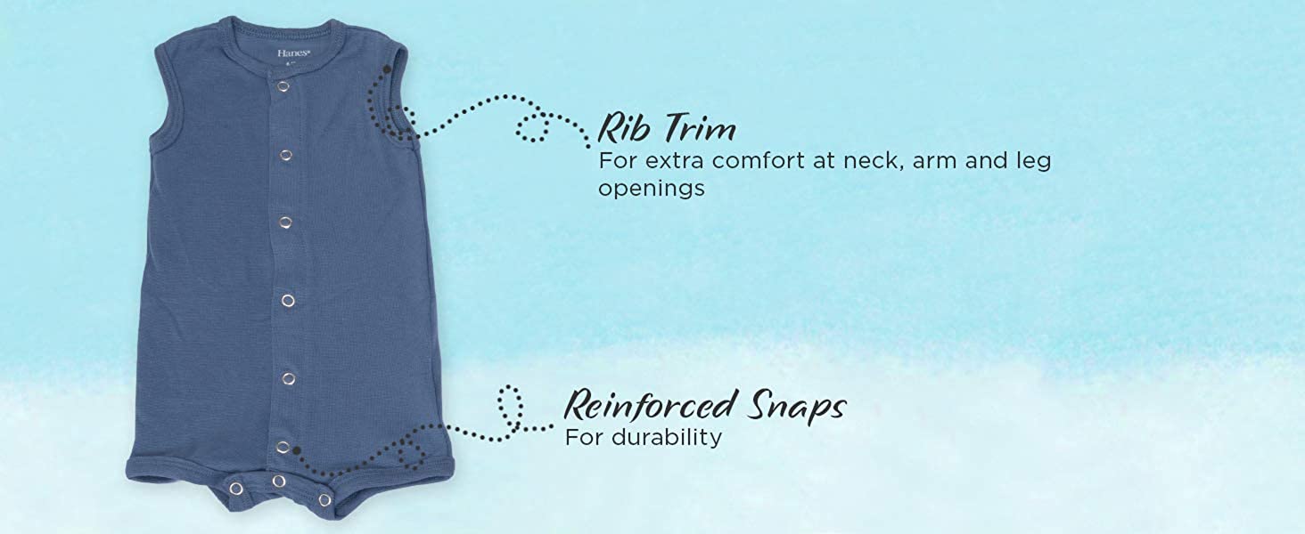 Hanes Ultimate Flexy 2 Pack Sleeveless Rompers were designed with baby in mind. They are super soft, flexible, and are available in 4 simple sizes to fit baby longer.
