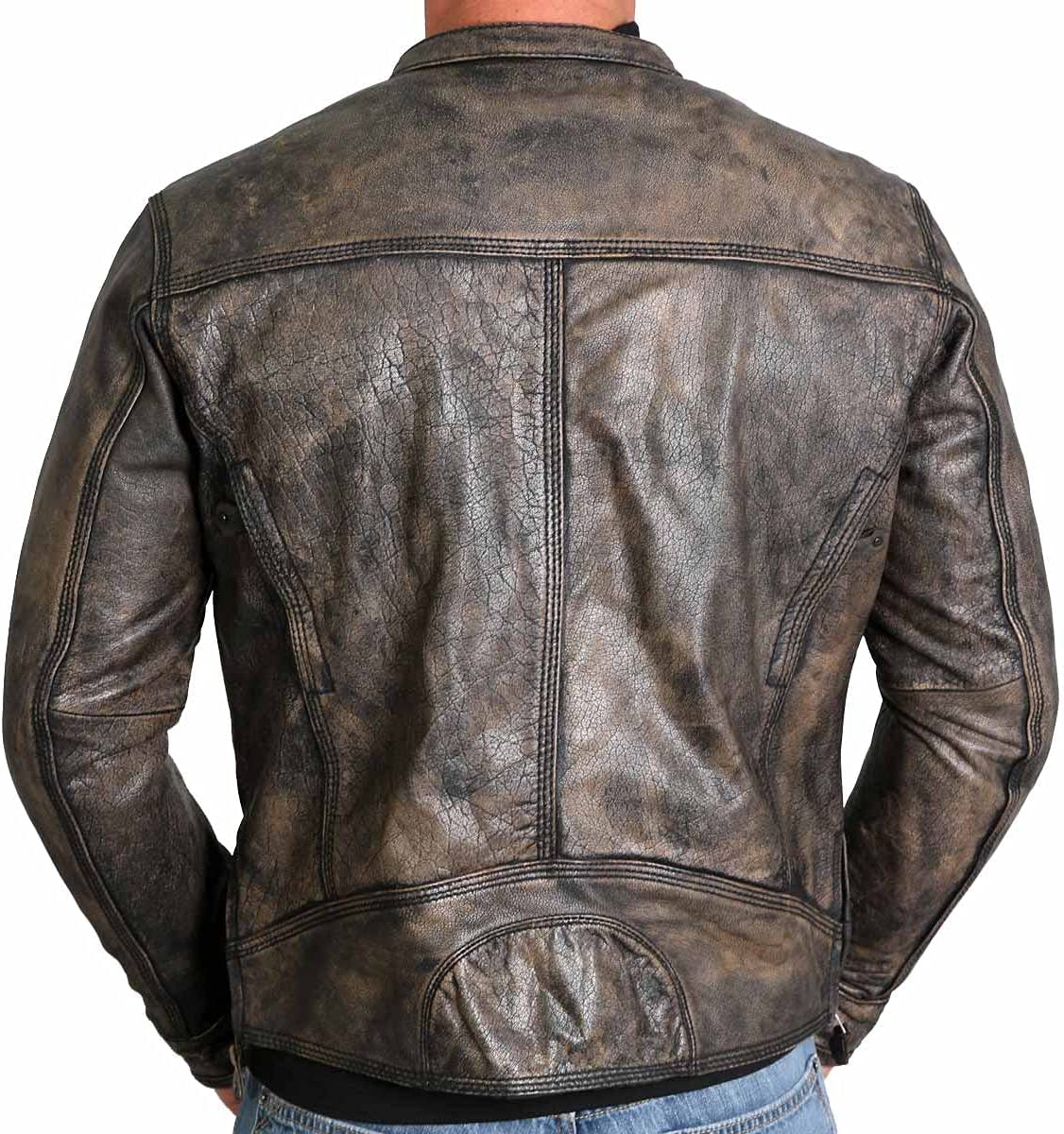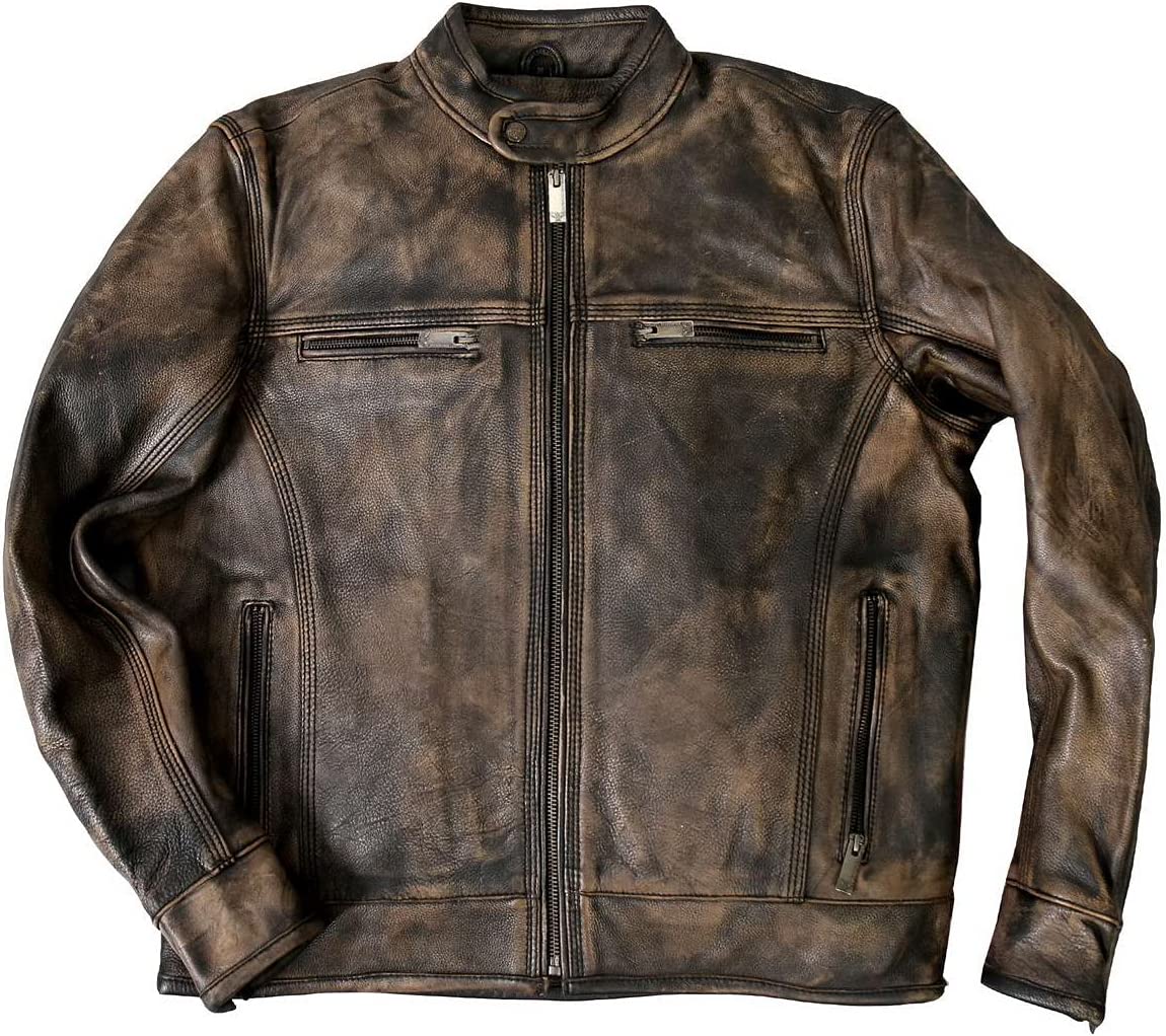 Hot Leathers JKM1019 Men's Distressed Brown Leather Jacket with Gun Pockets A men's brown racing jacket in a heavyweight, top grain leather with zip-out quilted lining for added comfort. The jacket also includes a stand-up racing collar with snaps, 4 zipper pockets, two inside concealed carry pockets, zipper cuffs and 4 zipper vents. This jacket does not come with leather zipper pull extensions. Heavyweight top grain leather Stand-up racing collar with snaps 4 zipper pockets Two inside concealed carry pockets Zipper cuffs and 4 zipper vents