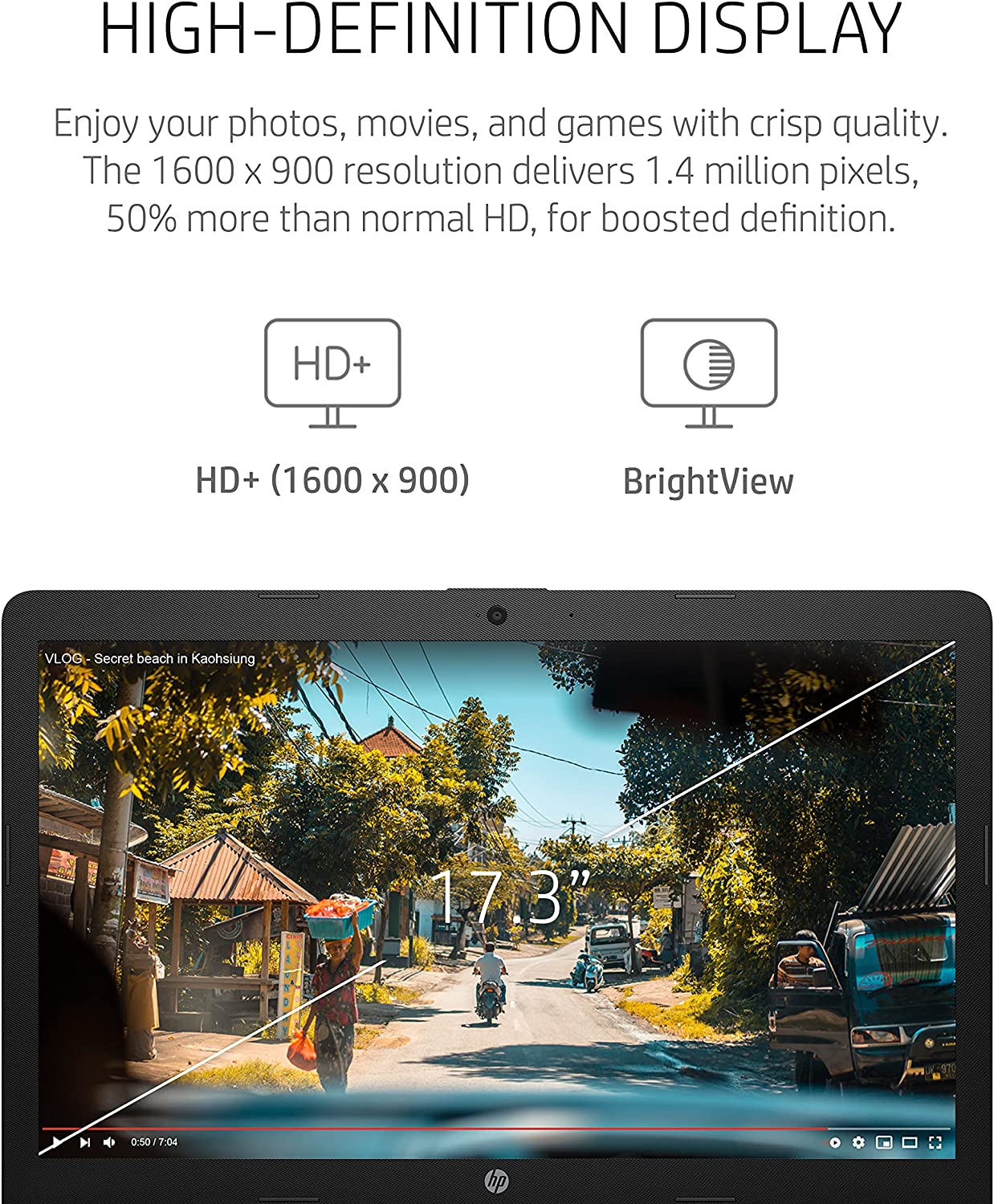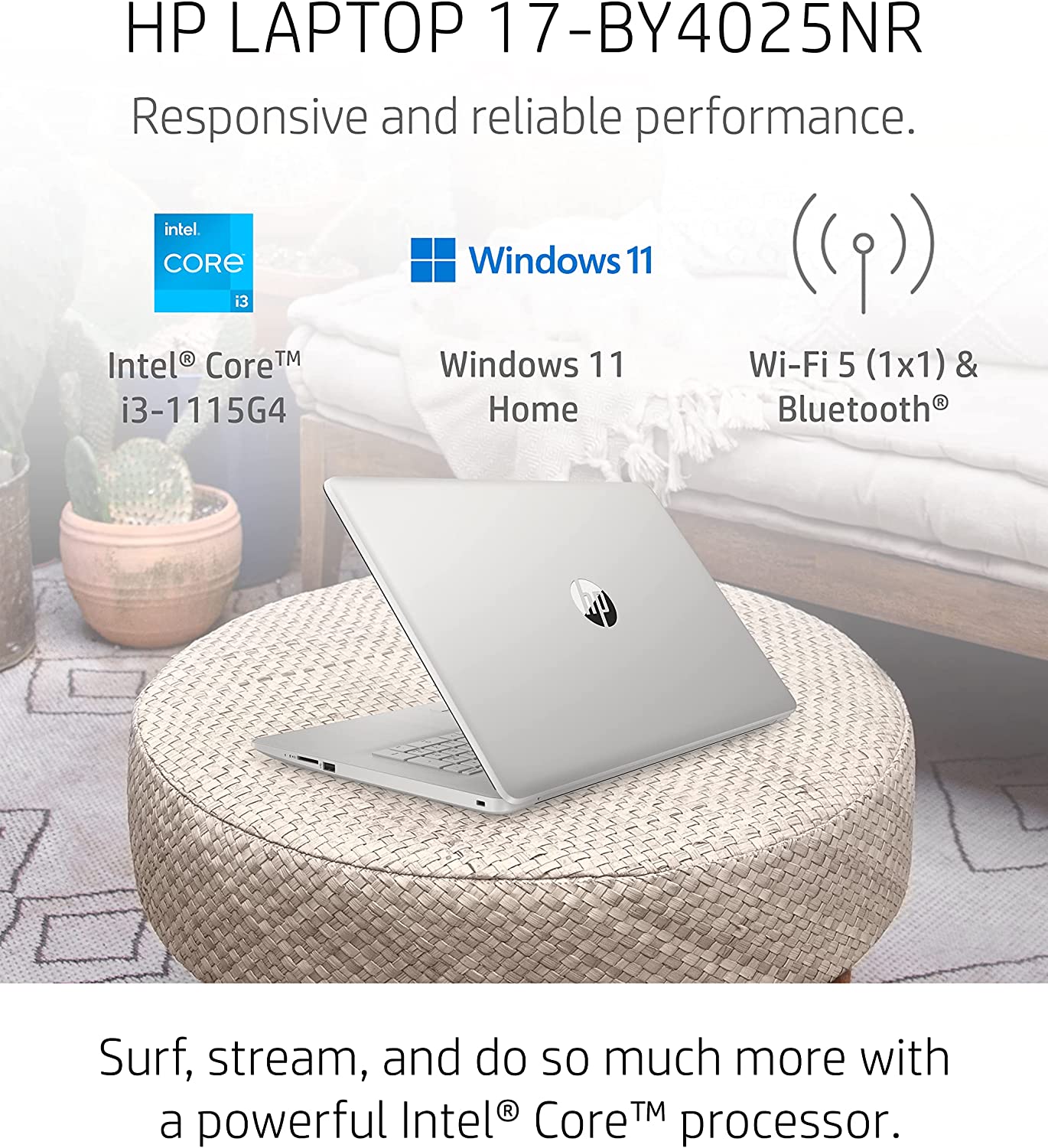 Thoughtfully crafted, the HP 17 Laptop PC blends style with performance and comfort. With its sleek, stylish design, full-sized keyboard and integrated numeric keypad, this eye-catching laptop looks as good as it performs and lets you work comfortably from anywhere. Enjoy your photos, movies, and games with the crisp quality of 1.4 million pixels on a 17.3-inch diagonal, HD+ (1600 x 900) screen (1). Enjoy fast performance and modern graphics thanks to the powerful combination of the 11th Generation Intel Core i3-1115G4 processor (2) and Intel UHD Graphics (3). With its 256 GB PCIe NVMe M.2 Solid State Drive (4), your HP computer laptop offers the storage you need with up to 15x faster performance than a traditional hard drive (5), plus 4 GB of DDR4-2666 MHz RAM (1 x 4 GB) to get things done. This HP laptop computer takes work and play to new levels with up to 8 hours of battery life (6). Plus, recharge your laptop up to 50% in approximately 45 minutes with HP Fast Charge (7). The latest Windows 11 Home OS comes pre-installed, and features secure boot-ups, increased responsiveness, and advanced protections to defend against the latest cyber threats (1). Stay connected with an 802.11a/b/g/n/ac (1x1) Wi-Fi and Bluetooth combo (9) (10). Additionally, your notebook laptop is covered by a 1-year limited warranty. Keep up the productivity from anywhere. This Windows 11 laptop has everything you need for clear, vibrant video calls with an HP TrueVision HD camera, integrated digital microphone (11), and custom-tuned dual speakers. Do the environment—and your wallet—a favor with an HP laptop that’s ENERGY STAR certified (12) and EPEAT Silver registered (13) to meet strict energy efficiency standards.